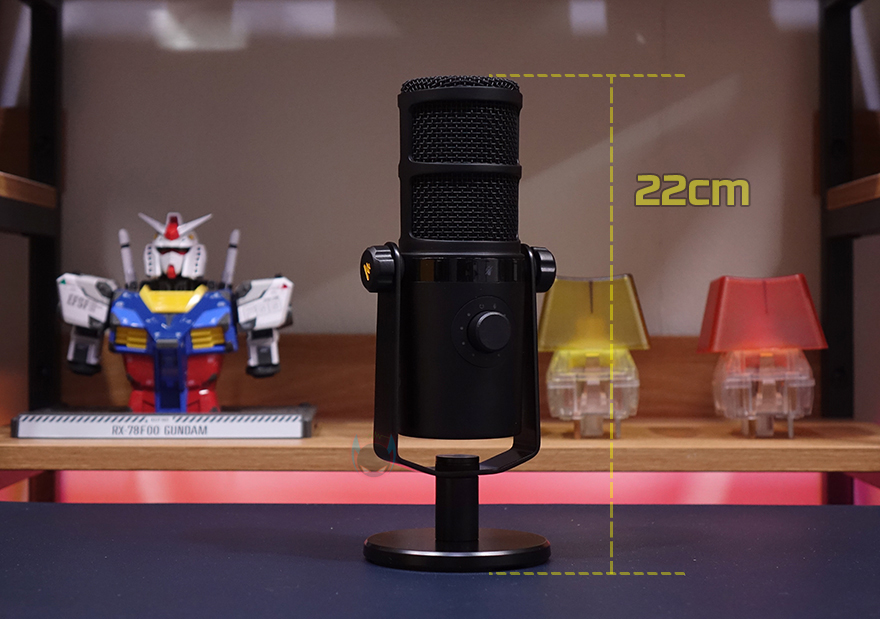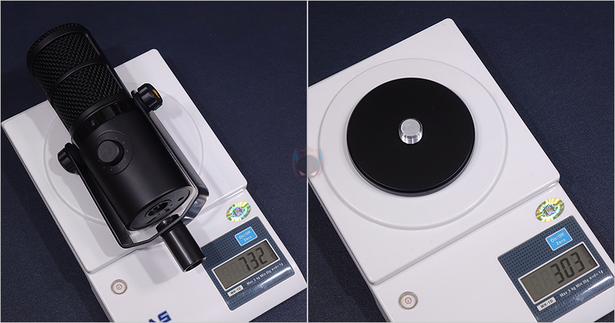 마오노(MAONO) PD400X 마이크를 본격적으로 살펴보면, 일단 방금 구성품에서 확인했듯이 테이블에 놓고 사용할 수 있게 기본 받침대(Stand)를 제공해주고 있습니다. 그래서, 기본 사용으로는 마이크 목부분과 받침대를 결합해주면 되는데, 그전에 마이크의 무게를 측정해보면, 약 732g, 받침대는 약 303g으로 마이크부터 받침대까지 올-메탈(All-Metal) 소재로 묵직함을 가지고 있습니다. 또한, 마이크 목부분에는 받침대와 연결되는 5/8인치 나사-홀과 안쪽에 3/8인치와 연결할 수 있는 나사-홀 2가지 규격을 갖추고 있으며, 받침대 밑바닥에는 미끄럼 방지 패드도 부착되어 있죠. 참고로 마이크와 받침대를 연결한 상태에서 높이는 약 220cm입니다.