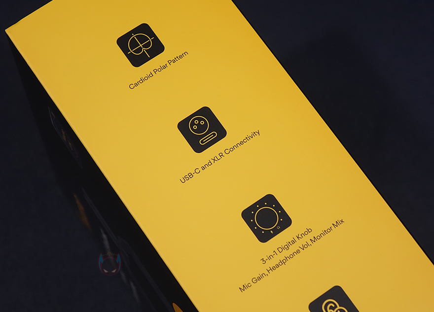 제품 패키지부터 살펴보면, 박스는 전체 비닐밀봉으로 처리되어 있어 판매 제품에 소비자가 신뢰를 가질 수 있도록 했으며, 박스 전면에는 제품 이미지가 실려있어서 미리 마이크 디자인을 간접적으로 확인할 수 있습니다. 또한, 모델명과 함께 USB/XLR 연결 인터페이스 지원 문구를 확인할 수 있죠. 일반적으로 유튜브 마이크라는 불리는 제품들이 대부분 USB 인터페이스만 갖추고 있는 경우가 많기 때문에, XLR 인터페이스까지 갖추고 있다면 사용자 폭이 넓어서 더욱 매력 있다 할 수 있습니다. 이 부분은 뒤에서 다시 한번 강조하겠습니다.
