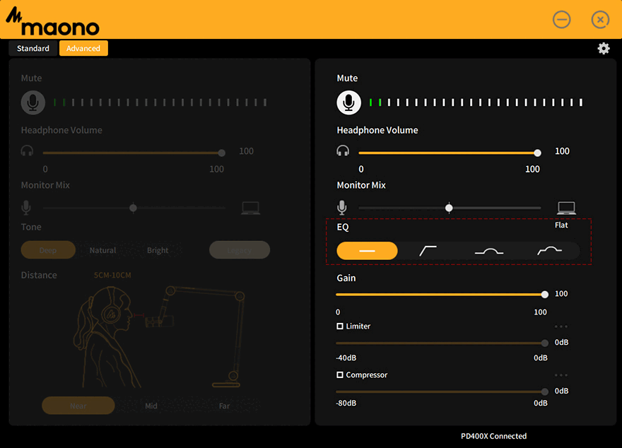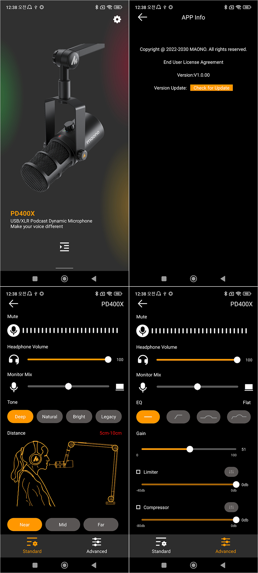 MAONO Link 프로그램을 좀 더 자세히 살펴보면, 설정 메뉴는 크게 2가지로 기본설정(Standard)와 고급설정(Advanced)으로 나뉘는데, 기본 설정에선 마이크 자체에 담고 있는 마이크 음소거(Mute), 헤드셋 볼륨(Headphone Volume), Monitor Mix 외에도 추가로 목소리 톤(Tone)을 조절할 수 있는 기능과 마이크 거리(Distance) 조절 기능이 있습니다. 목소리 톤(Tone) 같은 경우에는 Deep, Natural, Bright, Legacy 4가지 중 선택할 수 있는데, Natural은 Deep보다 좀 더 톤이 낮아지며, Bright와 Legacy는 Deep, Natural보다 톤이 좀 더 높아집니다. 그리고, 마이크 거리(Distance)는 실제 마이크 거리와 상관없이 가상으로 거리 조절에 따른 목소리 크기가 조절되는 기능으로 멀어질수록 소리가 커집니다.