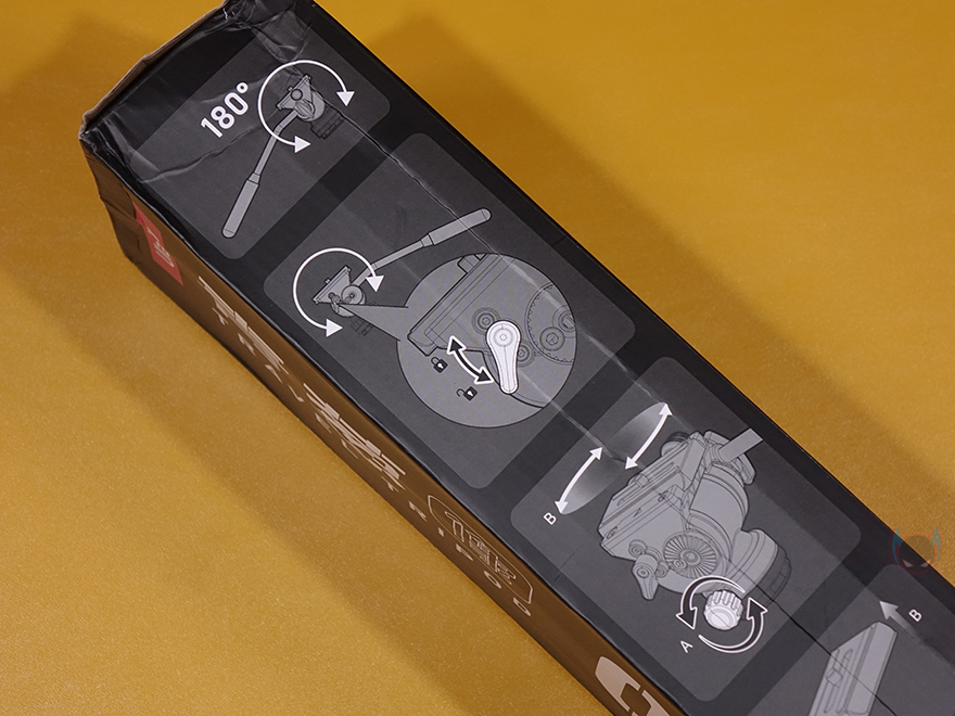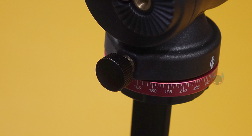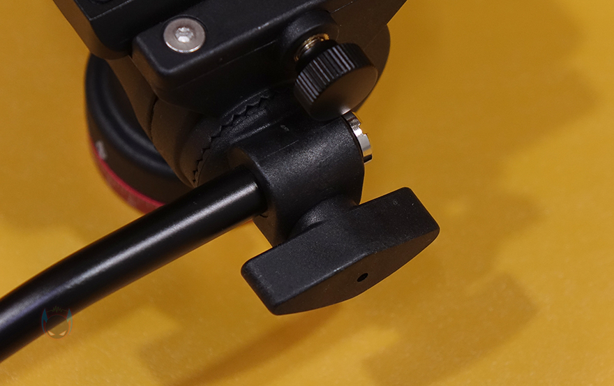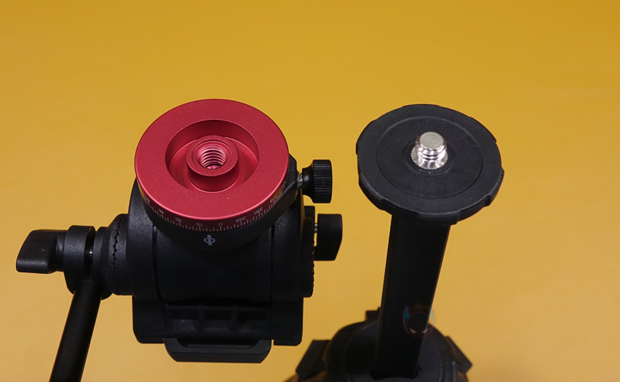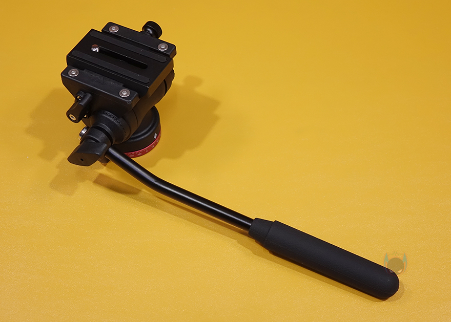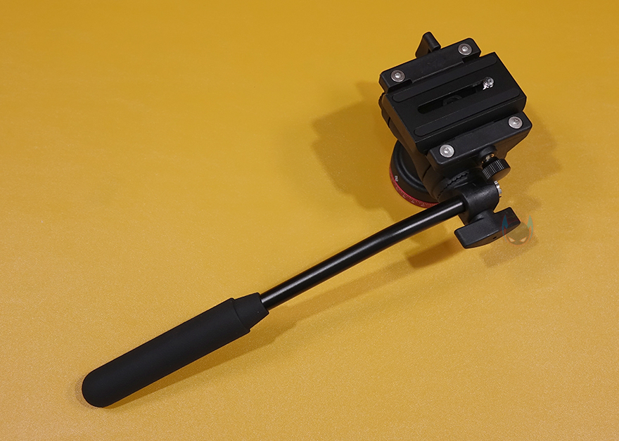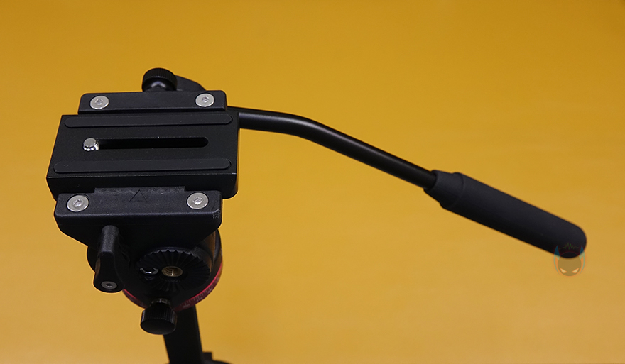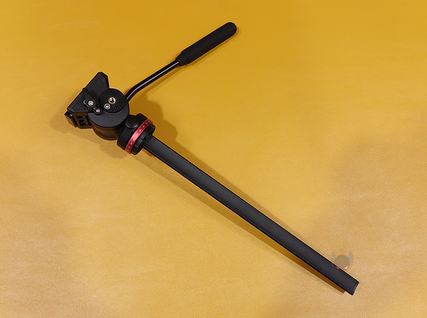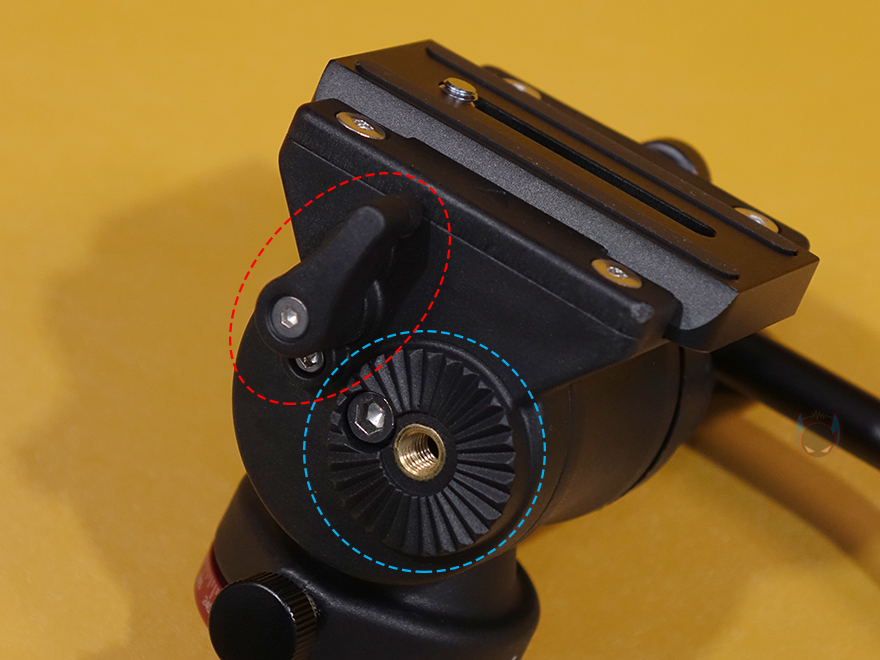 또한, 아래에 배치된 큰 핸드 스크류는 바로 손잡이 핸들-바를 상하 조절할 수 있게 해주는데, 손잡이부분에는 그립감을 위해 고무커버를 적용하고 있습니다. 그리고, 왼쪽 측면에 있는 레버가 하나 있는데, 바로 이 핸들-바를 사용해 카메라를 상하 각도조절 할 수 있죠. 최대 180˚까지 조절할 수 있습니다. 참고로, 핸들-바는 기본 오른쪽에 장착되어 있지만 스크류를 모두 풀면 분리가 가능하고, 반대쪽 왼쪽으로 위치변경할 수 있습니다. 그리고, 헤드 맨 아래 배치된 핸드 스큐를 좌우로 회전할 수 있게 해주는데, 최대 360˚까지 회전할 수 있습니다.