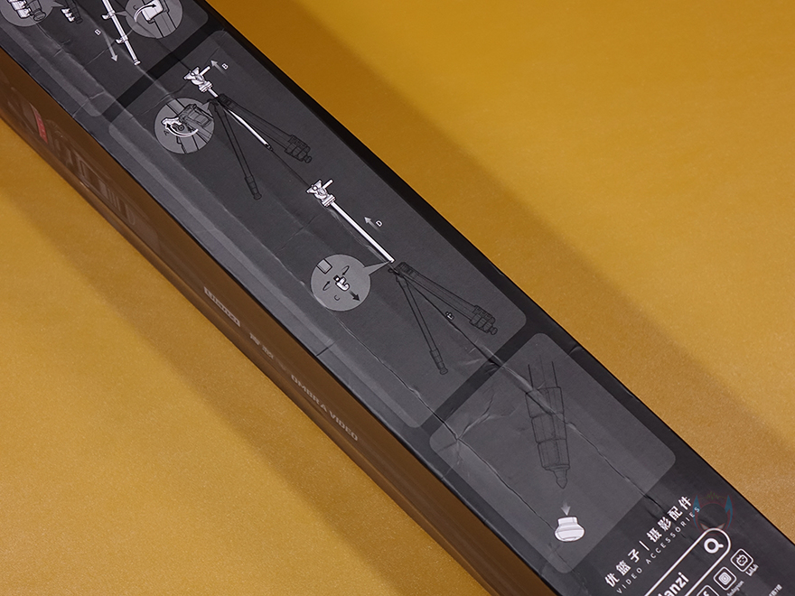 제품박스부터 살펴보는데, 시작에 앞서 배송중에 박스상태가 양호하지 않은점 이해주면 감사하겠습니다. 일단 박스는 삼각대 제품답게 긴 박스형태로 전면에 'OMBRA VIDEO'라는 모델명과 함께 반대쪽에는 제품 이미지를 담고 있습니다. 제품 이미지에서 이미 헤드 손잡이를 볼 수 있죠. 그리고, 양쪽 측면에는 각각 그림 이미지로 제품 사용법을 담고 있는데, 뒤에서 확인하겠지만, 별도의 설명서는 들어있지 않습니다. 사실 다른 삼각대 제품들도 대부분 사용설명서는 없죠. 삼각대 사용이 특별히 어려운게 아니라서. OMBRA VIDEO 여행용 삼각대 역시 충분히 박스에 담긴 사용법 이미지만 봐도 이해가 됩니다. 그리고, 한쪽에는 제품의 기본 사양도 표기를 해놨죠.