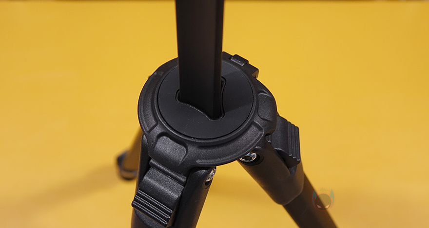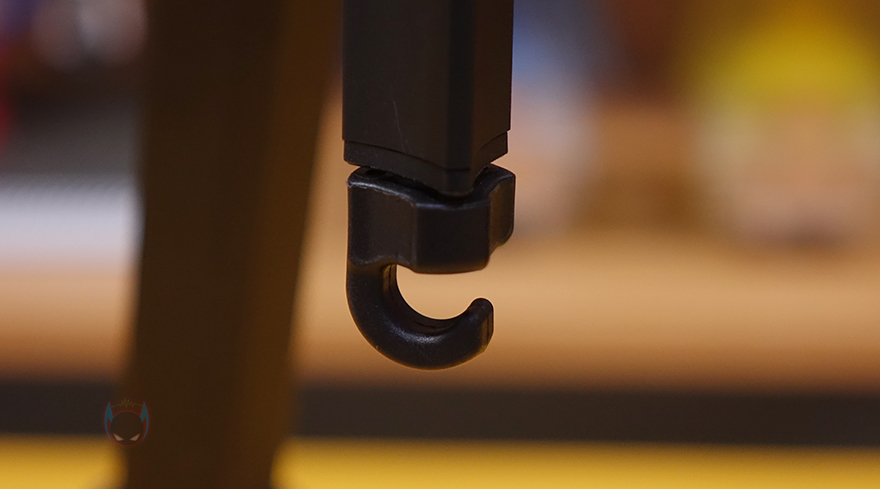 그리고, 삼각발 맨 윗부분 한 측면에는 버클이 적용되어 있는데, 바로 위아래로 높이를 조절하는 수직봉을 잠금/해제할 수 있는 버클로 수직봉은 최대 38.5cm까지 높일 수 있으며, 봉 모양은 삼각형 모양을 가졌습니다. 또한, 수직봉 맨 아래에 무게추를 달 수 있게 후크도 있는데, 후크를 풀면 수직봉을 완전리 분리할수도 있죠.