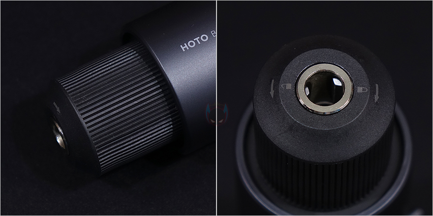 부위별로 좀 더 자세히 살펴보면, 일단 메탈그레이 색상부분은 실제 메탈(Metal) 소재가 사용되었으며, 측면에 'HOTO Brushless Drill'라고 표기를 해놨죠. 참고로, 손잡이부분과 후면 검은색부분은 TPU 고무 코팅으로 처리해 부드러운 질감을 줍니다. 그리고, 모두 무광택으로 처리해서 고급스러운 느낌도 주죠. 손잡이부분에는 사용작동 역할을 하는 트리거(Trigger)가 적용되어 있으며, 다른 드릴 제품들처럼 트리거 윗부분에는 앞/잠금/뒤(Forward/Lock/Reverse) 스위치 버튼이 적용되어 있습니다. 또한, 스위치는 방향표시를 통해 쉽게 앞/뒤 구분을 할 수 있는데, 잡고 있는 상태에서 스위치가 중간에 위치하면 트리거가 작동하지 않으며, 왼쪽으로 스위치를 옮기면 앞으로 그러니깐 드릴이나 드라이버를 사용했을 시 뚫거나 나사를 체결하는 방향으로 작동하고, 오른쪽으로 스위치를 옮기면 반대로 빼거나 푸는 작동을 합니다.