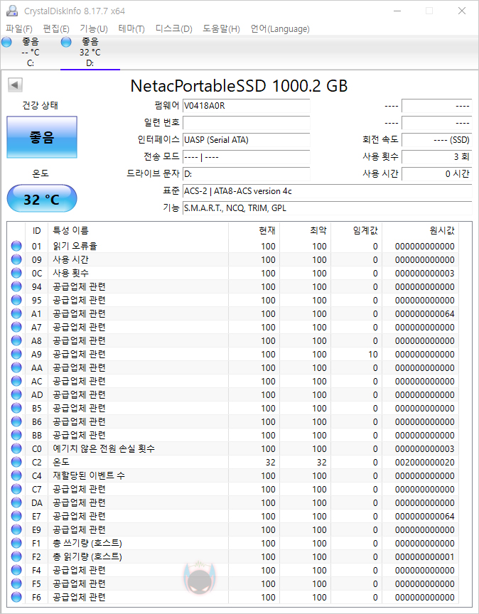직접, Netac ZX20 외장 SSD(external SSD)를 사용해봐겠죠?! ZX20은 앞서 확인했듯이 USB 3.2 Gen2x2 방식으로 최대 20 Gbps 속도를 구현합니다. 물론, 이를 구현하기 위해서는 데이터 케이블도 20 Gbps를 지원해야 하며, PC와 노트북에 적용되어 있는 USB Type-C 포트도 USB 3.2 Gen2x2 방식으로 20 Gbps를 지원해야 하죠. 물론, 이보다 아래인 USB 3.2 Gen2, USB 3.2 Gen1, USB 3.1, USB 3.0 등에서도 사용 호환은 되지만, 속도는 10 Gbps, 5 Gbps로 낮아집니다. 참고로, 최근 PC들은 대부분 USB 3.2 Gen2x2 포트를 최소 1개 정도는 갖추고 있습니다. 그리고, 앞서 언급한 대로 20 Gbps 속도면 현재 외장 SSD에서도 최고 속도인데, 아직 시장에 판매 제품들이 많은 편은 아니기 때문에 일반적으로 소비자들이 가장 많이 접하는 속도는 10 Gbps 외장 SSD라 할 수 있습니다. 그래서, 성능 비교는 10 Gbps 외장 SSD와 해보겠습니다.