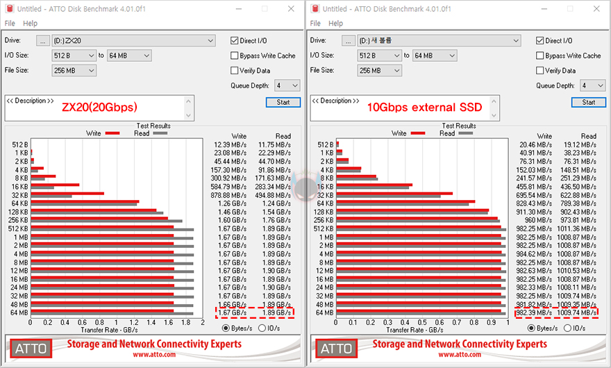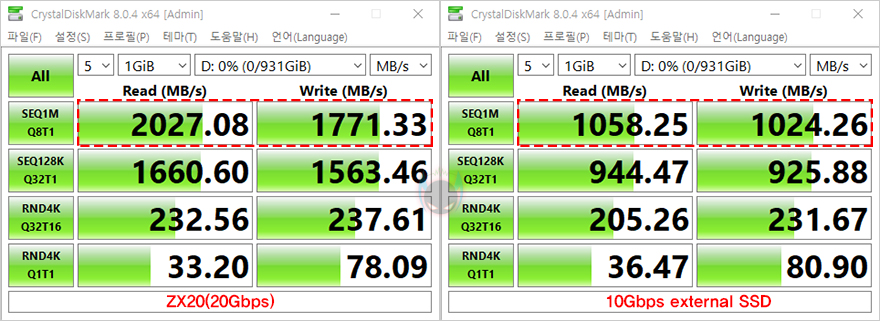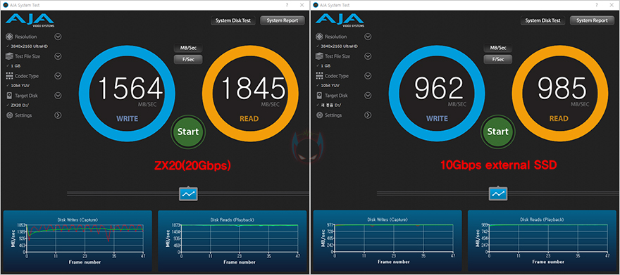 추가로 벤치마크 프로그램들을 통해 ZX20과 10 Gbps 외장 SSD의 성능을 비교해보면, 모두 ZX20이 20Gbps 지원 제품답게 월등히 앞서는 것을 확인할 수 있습니다. 속도로 측정되는 프로그램에선 거의 2배 가까운 성능차이를 보여주고, 점수로 측정되는 프로그램에서도 앞서는 것을 확인할 수 있죠. 그리고, 실제로 10GB 파일(File)을 전송할 때 속도 비교를 해보면, ZX20은 1GB/s 속도(Speed)를, 10Gbps 외장 SSD는 670MB/s대의 속도로 ZX20 외장 SSD가 더 빨리 전송되는 것을 확인할 수 있습니다.
