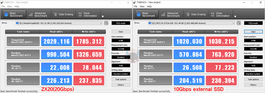 성능 확인에 앞서 CrystalDiskInfo를 통해 ZX20에 탑재된 SSD의 정보를 확인해보는데, 별도의 명칭없이 Netac 명칭으로 나오는 걸 봐서는 자사의 SSD 제품이 탑재되었음을 짐작할 수 있습니다. 그리고, NCQ나 TRIM, GPL 등의 기능 지원도 확인할 수 있죠. 먼저 가장 기본적인 성능 확인으로 SSD 제품들이 기본 사양에 속도 표기를 할 때 주로 사용되는 CrystalDiskMark를 통해 성능을 확인해봤는데, 무작위(Random)와 순차(0 Fill) 접근 모두 사양 표기대로 ZX20 외장 SSD 읽기(Read) 성능이 최대 2000MB/s로 측정되는 것을 확인할 수 있습니다. 쓰기(Write) 속도도 최고속도는 아니지만, 10 Gbps 외장 SSD와 비교하면 월등히 앞서는 속도죠. 참고로, 읽기와 쓰기 속도가 동일하지 않는 점은 내장된 SSD 자체의 읽기와 쓰기 속도가 동일하지 않기 때문입니다.