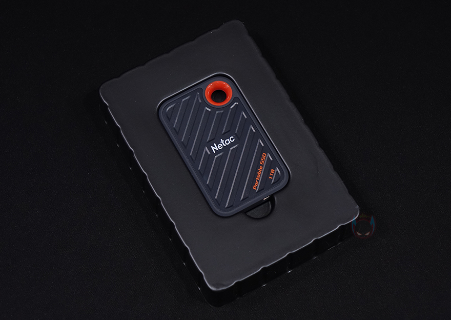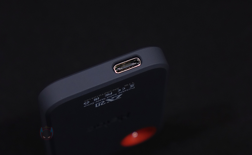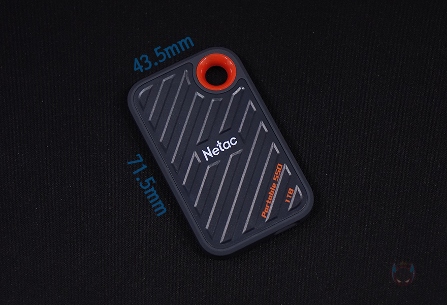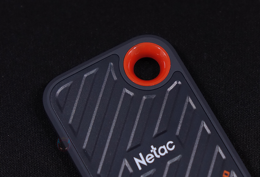 좀 더 자세히 살펴보면, 색상은 옅은 청록색(Pale bluish green)이며 케이스 상판부분은 플라스틱 재질로 빗살무늬의 홈-처리 디자인과 함께 가운데 Netac 로고(Logo)를 새겨놨으며, 아랫부분에 외장 SSD와 용량 표기를 확인할 수 있습니다. 참고로, ZX20은 512GB와 1TB 2가지 용량으로 출시되었습니다. 그리고, 오른쪽 윗부분에는 휴대 시 가방 같은 곳에 걸 수 있게 고리 디자인도 적용되어 있죠. 그리고, 측면 아랫부분에는 USB Type-C 포트가 적용되어 있는데, 앞서 여러 번 확인했듯이 USB 3.2 Gen2x2 방식까지 지원합니다. 그리고, 테두리와 후면 전체는 외부 충격방지 및 미끄럼 방지를 위해 고무 코팅(rubber coating) 소재를 적용했습니다.