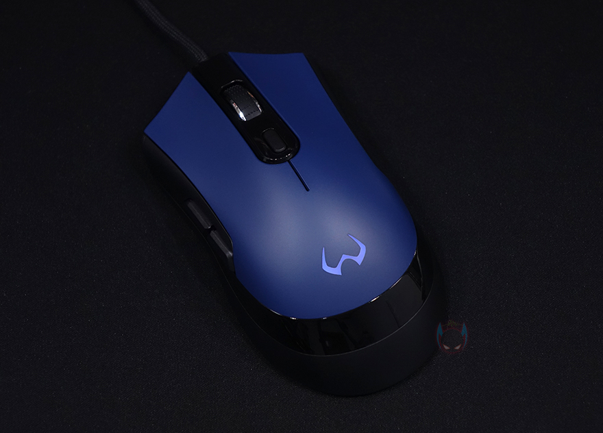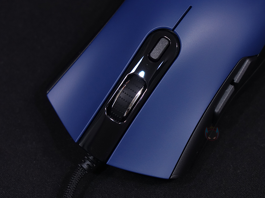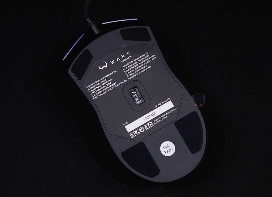 그리고, 기본 좌우 버튼 같은 경우 앞서 언급하고 사양 표기에서 확인했듯이 워프 WM1에서 사용되었던 후아노(HUANO) 스위치가 이번에도 적용되었으며, 2천만 회 클릭수명을 가졌죠. 그리고, 휠-버튼은 접지력을 위해 돌기 형태로 처리되어 있으며, 바로 뒤에는 DPI 버튼이 배치되어 있는데, 뒤에서 확인하겠지만, DPI 버튼은 왼쪽 버튼과 함께 RGB 모드 전환 기능으로도 사용됩니다. 좌우 측면은 동일한 디자인에 왼쪽 측면에 2개의 추가 버튼이 적용되어 있으며, 마우스 밑바닥 부분에는 모서리 부근에 부드러운 움직임을 위해 저마찰 패드를 기본 부착해놨죠. 가운데는 광센서 위치로 내부에 워프 WM1에서도 동일하게 적용되었던 PixArt 사의 PMW3370 칩셋이 내장되어 있습니다. 그리고, 케이블은 전체 슬리빙처리의 꼬임 방지를 위한 파라코드 케이블 형태이며 총 1.9m 길이를 가졌고, 신호손실 최소화를 위해 노이즈 필터와 USB 인터페이스에 금-도금 처리도 적용되어 있습니다.