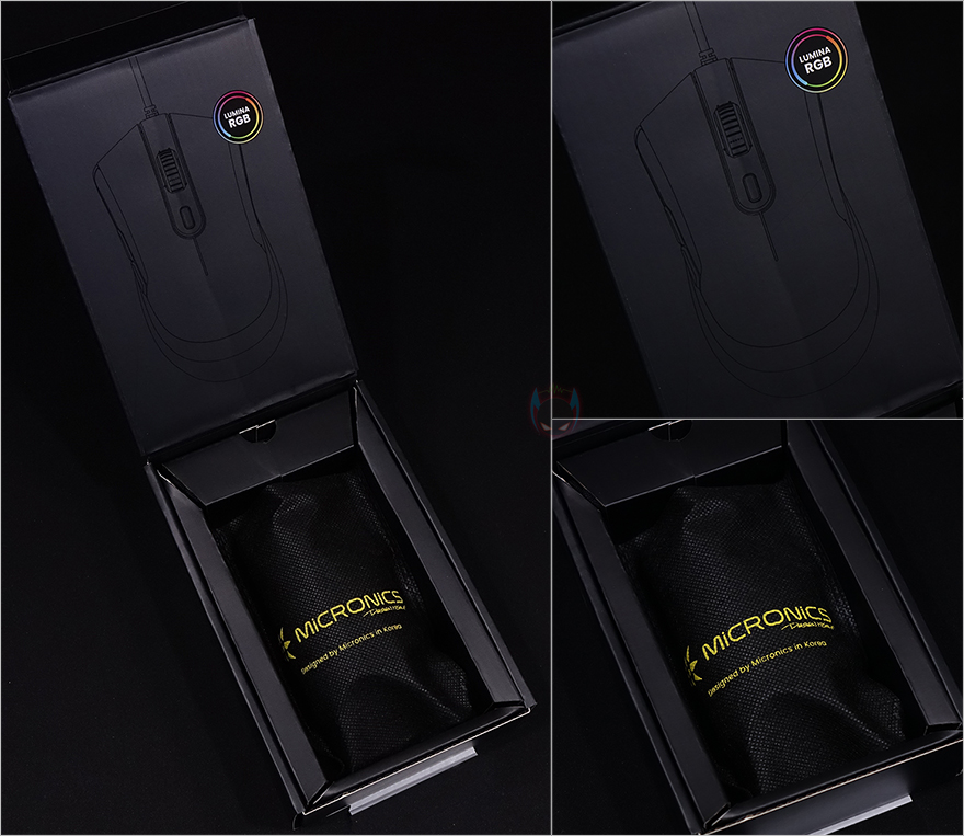 현재 마이크로닉스의 메카/워프/모프는 주력 게이밍 라인업이기 때문에 작년 첫 제품들부터 포장에도 상당히 신경을 쓰고 있죠. 워프 WM2 게이밍 마우스 역시 박스를 열어보면, 커버 안쪽에 다시 한번 라인 형태의 제품 이미지와 LUMINA RGB 표기를 확인할 수 있으며, 마우스 포장재도 흔히 보는 비닐 소재가 아닌 부직포 소재의 더스트 백을 제공해 주고 있어서, 재사용으로도 손색이 없습니다. 제품 구성은 워프 WM2 게이밍 마우스, 제품설명서, 워프 소개문으로 간단하게 이루어져 있습니다. 참고로, 마이크로닉스가 이렇게 포장에서부터 신경을 쓰는 이유는 국내시장뿐만 아니라 미국 같은 글로벌시장도 생각하고 있기때문이죠.