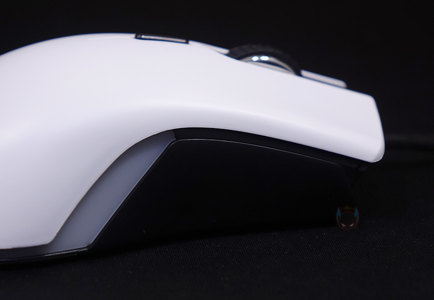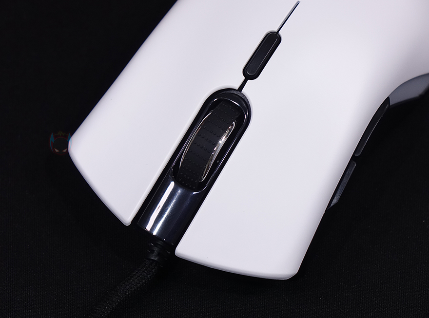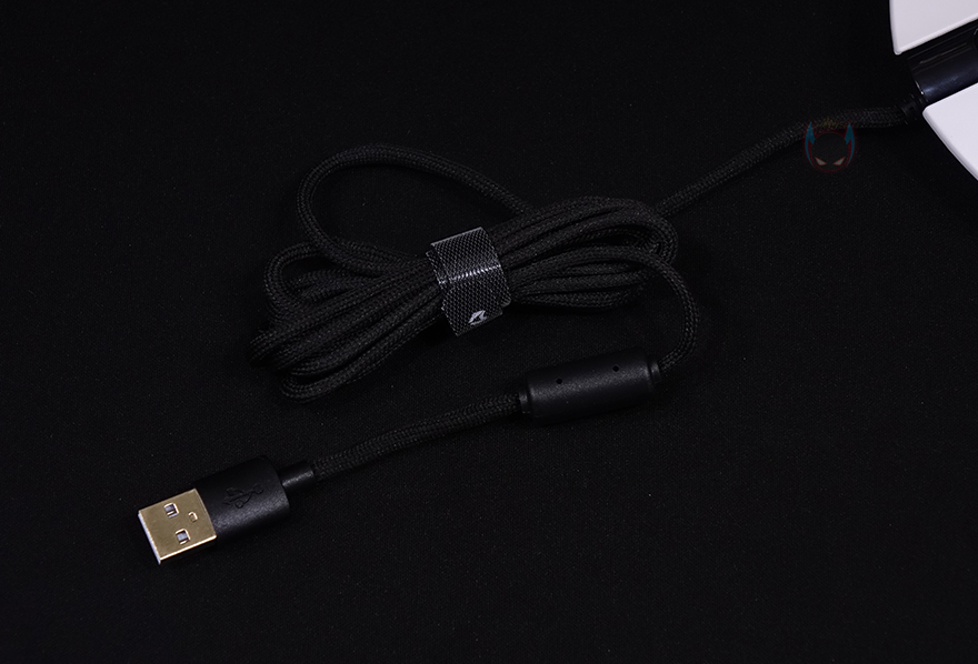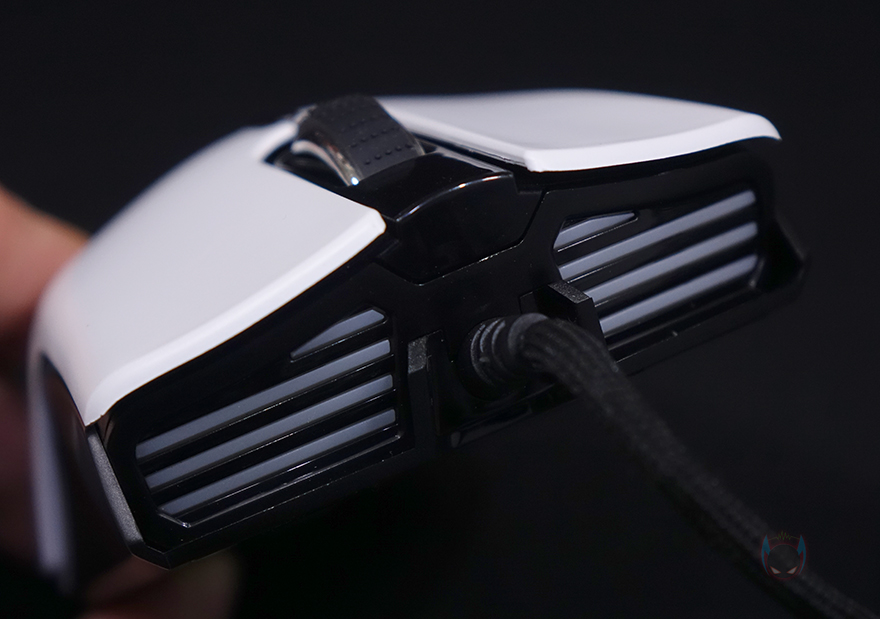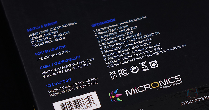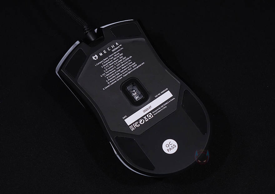메카 ZM2 게이밍 마우스를 좀 더 자세히 살펴보면, 기본 좌우 버튼에 가운데 배치된 휠-버튼에는 접지력을 위해 고무 커버에 돌기 디자인을 적용했으며, 바로 뒤에는 DPI 버튼이 배치되어 있는데, DPI 버튼은 기본 좌우 버튼의 왼쪽 버튼과 함께 RGB 모드 변경 기능으로도 사용됩니다. 그리고, 마우스 전면에는 자동차 라이트처럼 RGB 조명효과를 볼 수 있게 디자인 처리되어 있으며, 후면 상판과 하단의 경계 라인으로도 RGB 조명효과를 볼 수 있게 디자인 처리되어 있죠. 특히, 경계라인은 측면으로도 일부 이어집니다. 또한, 왼쪽 측면에는 추가 버튼 2개가 적용되어 있으며, 마우스 밑바닥 부분에는 모서리 부근에 부드러운 움직임을 위해 저마찰 패드를 부착해놨으며, 가운데는 센서 부분으로 앞서 사양 표기에서 확인했듯이 내부에는 PixArt 사의 PMW3370 칩셋이 내장되어 있습니다. 참고로, 기본 좌우 버튼의 스위치는 후아노(HUANO) 스위치로 2천만 회 클릭 수명을 가졌습니다. 끝으로, 케이블은 총 1.9m길이에 꼬임 방지를 위해 전체 슬리빙 처리된 파라코드 케이블을 사용했으며, 신호손실 최소화를 위해 노이즈 필터와 USB 인터페이스에 금-도금 처리도 적용되었습니다.