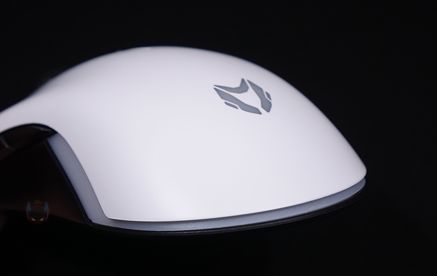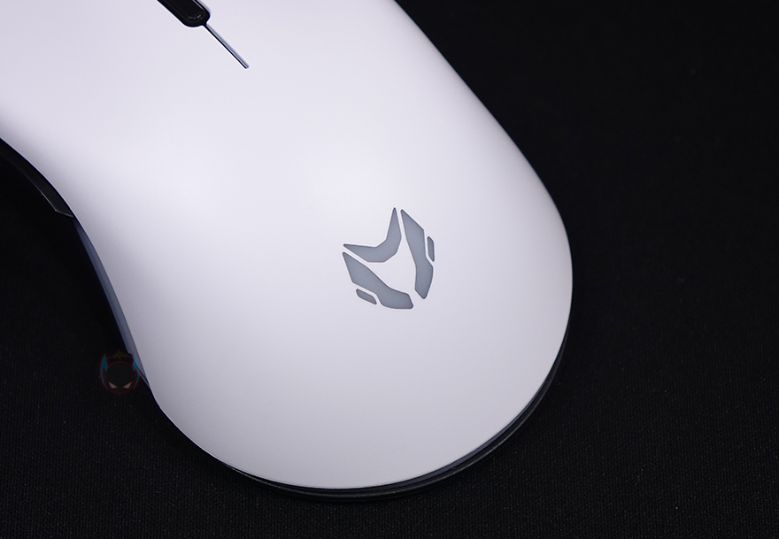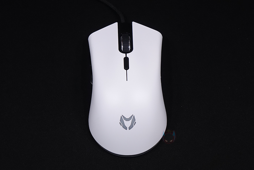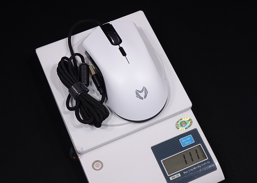 그럼, 본격적으로 마이크로닉스 메카 ZM2 게이밍 마우스를 살펴보는데, 일단 무게는 약 111g으로 앞서 박스에 표기된 무게 사양 오차 범위 그대로 보여줍니다. 참고로, 작년 첫 모델인 메카 ZM1보다는 5~8g 정도 무거워졌습니다. 그리고, 좌우대칭형 디자인에 상판은 앞에 버튼부터 뒤에 팜-레스트까지 일체형으로 색상은 화이트로 심플한 느낌을 주면서 로고도 새겨놨죠. 뒤에서 확인하겠지만, 로고 부분은 DPI 단계를 확인할 수 있는 LED 인디케이터 역할입니다. 좀 더 디자인에 대해서 언급하자면, 함게 출시한 워프 라인업의 워프 WM2와 비교해 보면 상판 디자인이 비슷하며, 반대로 작년 메카 ZM1과 비교해 보면 완전히 다른 디자인을 가졌죠. 또한, 사이즈도 전체적으로 좀 더 커졌습니다. 이 부분은 뒤에 그립 부분에서 좀 더 자세히 언급하겠습니다.