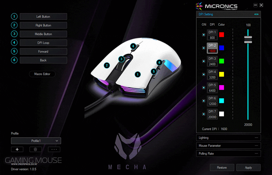 끝으로, 메카 ZM2 게이밍 마우스 역시 전용 프로그램을 제공해 주고 있는데, 정확히 말하자면 함께 출시한 워프 WM2와 동일한 소프트웨어로 인터페이스의 제품 이미지, 로고만 제외하면 나머지 기능 지원은 모두 동일합니다. 프로그램은 마이크로닉스 홈페이지에서 다운로드 받을 수 있으며, 프로그램을 실행해보면, 가운데 이미지를 기준으로 왼쪽에는 버튼 기능 설정, 매크로, 프로파일 등을 설정할 수 있으며, 버튼 설정 같은 경우에는 총 6개 버튼 표시가 있지만, 기본 좌우 버튼의 왼쪽 버튼이 고정이기 때문에 변경할 수 있는 버튼은 5개입니다. 그리고, 오른쪽에는 DPI 값 및 색상 변경, RGB 모드 전환, 마우스 기본 설정, 전송제어 속도 조절을 할 수 있는데, RGB 모드 전환은 앞서 왼쪽 버튼+DPI 버튼의 단순 모드 변경 외에 프로그램을 통해 색상과 모드 속도 조절도 추가로 할 수 있죠. 그리고, 전송제어 속도도 125/250/500/1000Hz 4단계로 지원해 주고 있어서, 사용자가 선택 변경할 수 있습니다.