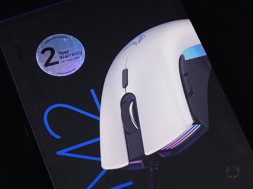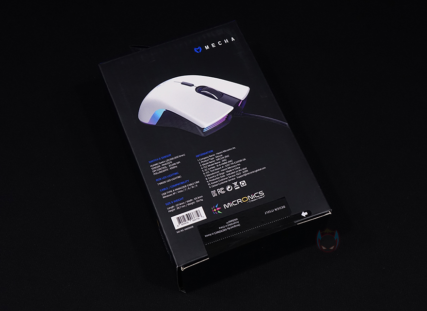 제품 박스부터 살펴보면, 전면에는 제품 이미지와 모델명, 그리고 2년 보증기간 스티커를 확인할 수 있는데, 시작에서 잠깐 언급했듯이 메카/워프/모프 라인업은 국내뿐만 아니라 해외시장도 생각하기 때문에 2년의 무상 보증기간을 지원해 주고 있습니다. 다만, 박스 디자인은 기존 제품들 틀에서 크게 벗어나지 않았고, 측면에는 'LUMINA(루미나)'라는 명칭으로 RGB 조명효과 지원 표기를 확인할 수 있는데, 작년 첫 제품들에선 RGB 명칭이 정해지지 않았지만, 이번 제품부터는 명칭이 정해진거죠. 박스 후면에는 메카 ZM2 게이밍 마우스의 풀-샷 이미지와 함께 제품의 기본 사양 표기를 확인할 수 있는데, 시작에서 언급했듯이 이번 하반기에 메카와 워프 라인업에 마우스가 동시 출시했기 때문에 센서와 스위치는 동일하게 적용되었습니다.