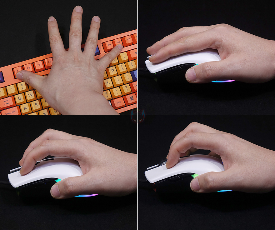그립 같은 경우에는 앞서 잠깐 언급했듯이 작년 메카 ZM1 모델보다 전체적으로 마우스 사이즈가 커졌습니다. 그래서, 필자의 손 크기가 키보드 기준으로 F10 정도인데, 실제 그립을 해보면 전형적인 마우스 그립 그러니깐 메카 ZM1 같은 경우에는 슬림 해서 좀 더 안쪽으로 감싸지는 그립감을 주었다면, 이번 메카 ZM2는 마우스의 기본이 되는 그립감을 줍니다. 또한, 가장 무난한 그립은 팜-그립이며, 클로-그립도 사용에는 무리가 없으며, 핑거-그립은 상판이 일체형이라 손가락이 뒤로 이동해도 클릭은 가능하나 부담감이 높아지겠습니다.
