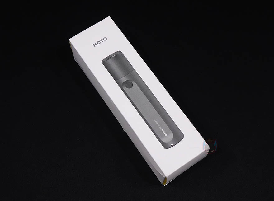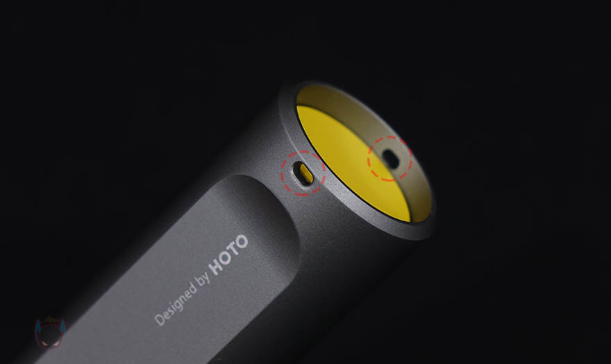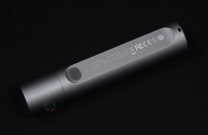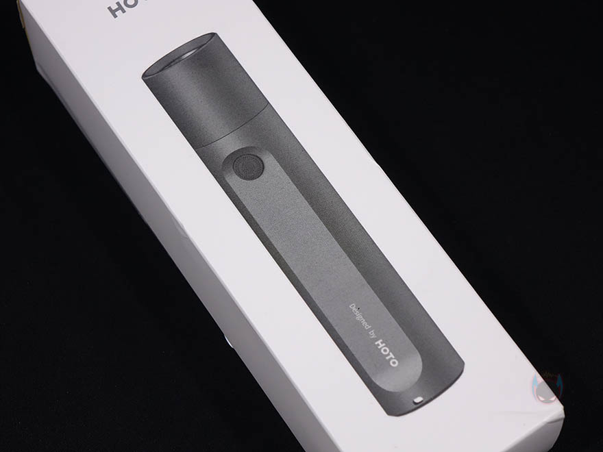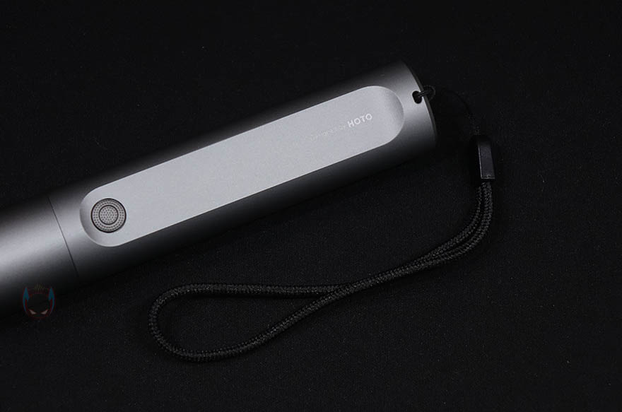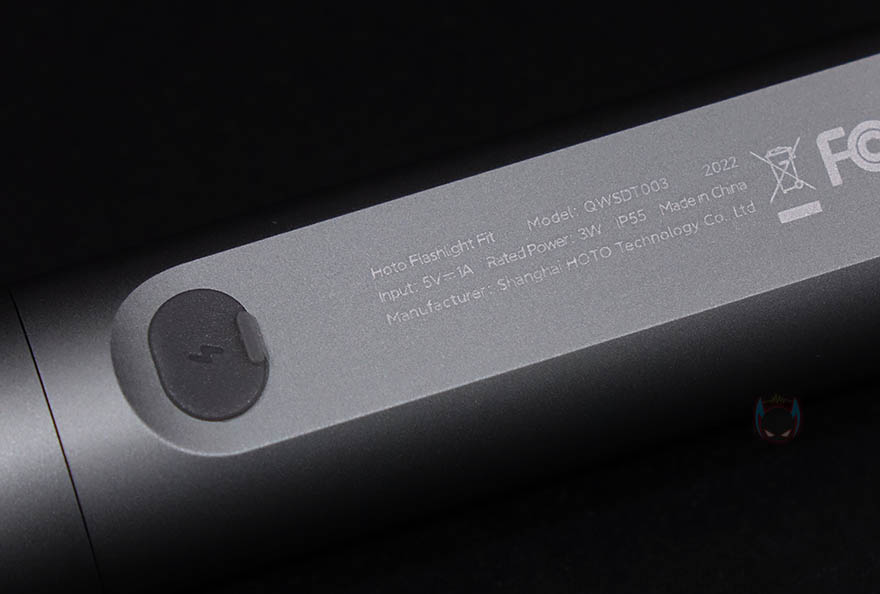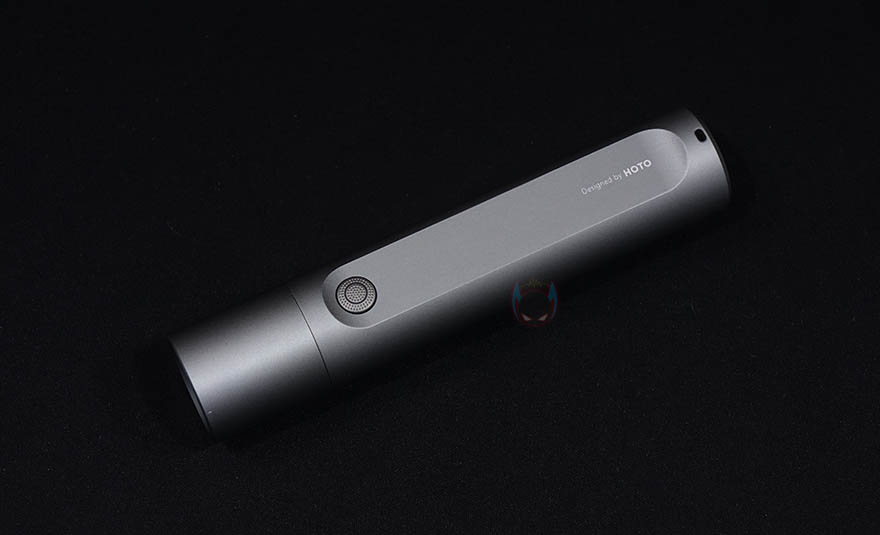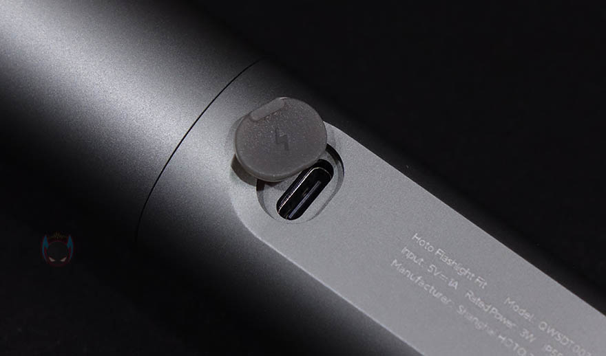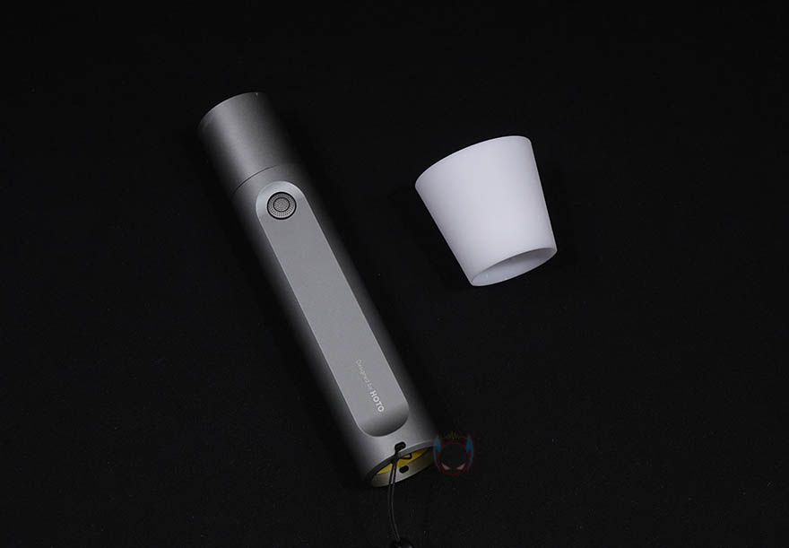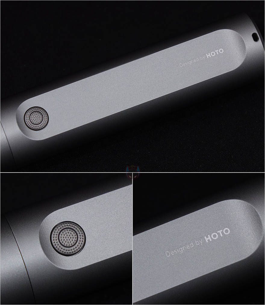 디자인을 좀 더 살펴보면, 손 그립이 되는 부분은 음각 형태로 평평한 표면으로 처리되어 그립이 편하도록 했으며, 그립 했을 때 앞부분에는 전원 및 기능 변경을 할 수 있는 버튼, 뒷부분에는 'Designed By HOTO' 문구를 새겨놨습니다. 특히, 버튼부분은 어두운 곳에서도 쉽게 감지할 수 있게 엠보싱(embossing) 디자인을 적용했으며, 배터리 상태 및 충전상태를 확인할 수 있게 LED 인디케이터도 적용되어 있는데, 이부분은 뒤에서 다시 확인하겠습니다. 그리고, 그립 시 반대편인 아랫부분에는 기본 사양 표기와 함께 충전케이블과 연결되는 USB Type-C 포트가 적용되어 있는데, 사용하지 않을시에 부식 및 먼지 유입방지를 위해 마개(cover)도 적용되어 있습니다.
