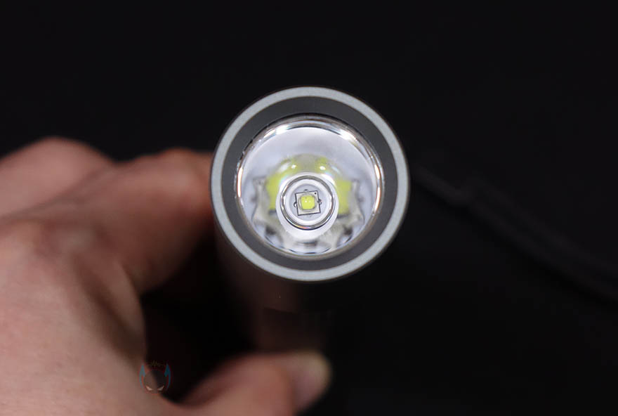 또한, 손전등 뒷부분에는 앞서 구성품에서 확인한 기본 제공의 랜야드(Lanyard) 줄을 걸 수 있는 홀(hole) 처리가 되어 있는데, 랜야드를 끼워서 걸면, 손목에 줄을 걸어 떨어뜨리거나 분실되지 않게 사용할 수 있습니다. 그리고, 플래시가 밝혀지는 전면에는 내부에 LED칩에 박혀있는걸 확인할 수 있죠. 끝으로, USB 충전케이블은 50cm 길이에 USB Type-C to A 인터페이스를 가졌습니다.