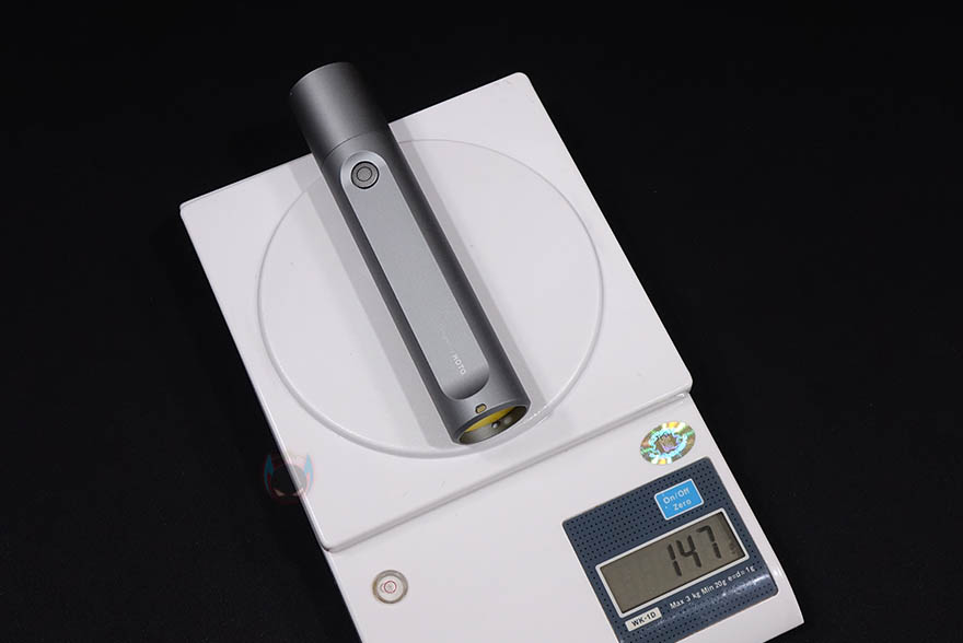 HOTO(호토) Flashlight Fit 손전등을 살펴보면, 색상은 메탈그레이(Metal-gray)계열이며, 길이는 145mm, 지름은 30mm로 뒤에서 다시 확인하겠지만, 한손에 착 감기는 소형 사이즈입니다. 스마트폰이나 보조배터리와 비교해보면 사이즈 차이를 더 쉽게 볼 수 있죠. 주머니 같은 곳에 넣고 다니기 편합니다. 무게도 약 147g으로 스마트폰보다 가볍죠.