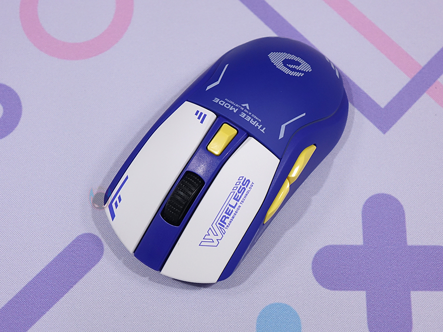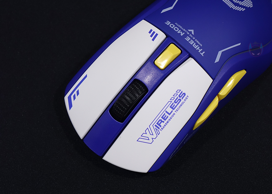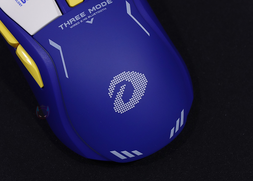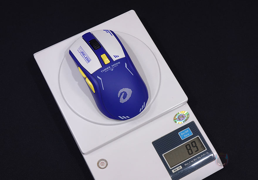 다시 마우스로 돌아와서 A950 마우스를 좀 더 자세히 살펴보면, 한눈에 봐도 디자인이 인상적이라는 걸 느낄 수 있죠. 단순히 색상만 적용한 게 아닌 문구와 포인트 같은 디자인을 적용하고 있습니다. 보통 이런 디자인은 커스텀 마이징 성격으로 한정판 같은 제품에서 볼 수 있다 할 수 있는데, 다얼유 A+ 라인업인 만큼 상당히 신경을 쓴 모습입니다. 그리고, 좌우대칭형에 무선 2.4 GHz 동글이 수납된 상태의 무게는 약 89g으로 무선 마우스치고는 가벼운 편에 속하죠.