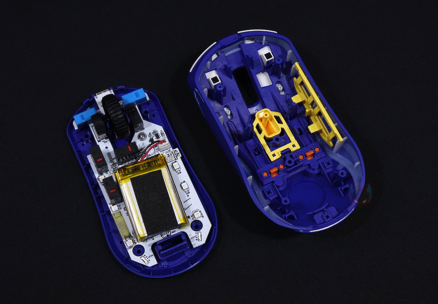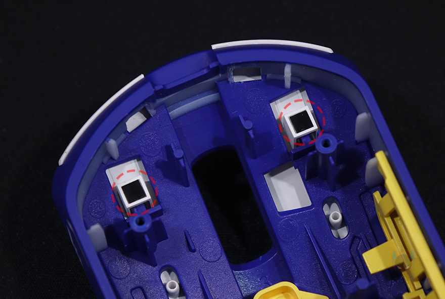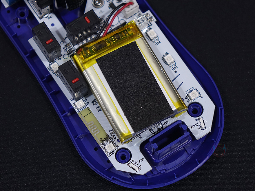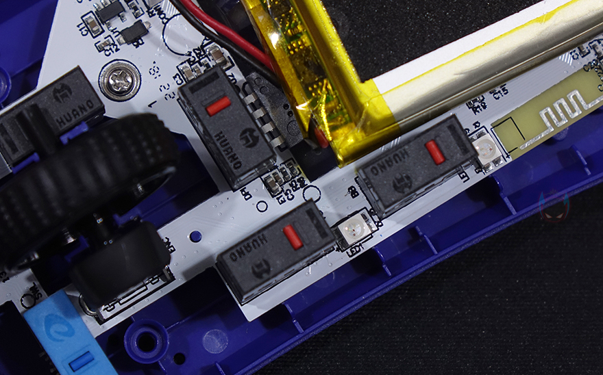 다얼유 A950 게이밍 마우스의 내부를 잠깐 살펴보면, 앞서 잠깐 언급했던 균일한 클릭감을 위해 적용한 KBS 2.0 기술에는 기본 좌우버튼의 내부 스위치 뎀버 부분을 ㅁ자로 형태로 한 부분도 기술의 뒷받침이 된다 할 수 있으며, 기본 좌우 버튼스위치의 경우 다얼유 로고가 새겨져 있어서 자체 개발 스위치인 것으로 짐작할 수 있으며, 나머지 휠-버튼과 DPI, 측면 버튼들은 모두 후아노(HUANO) 스위치를 사용했습니다. 그리고, 센서와 배터리 주변 PCB부분에 RGB 조명 효과를 위해 LED칩이 박혀있는 것을 확인할 수 있습니다.