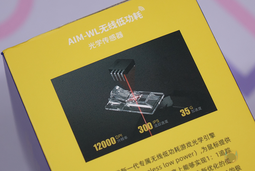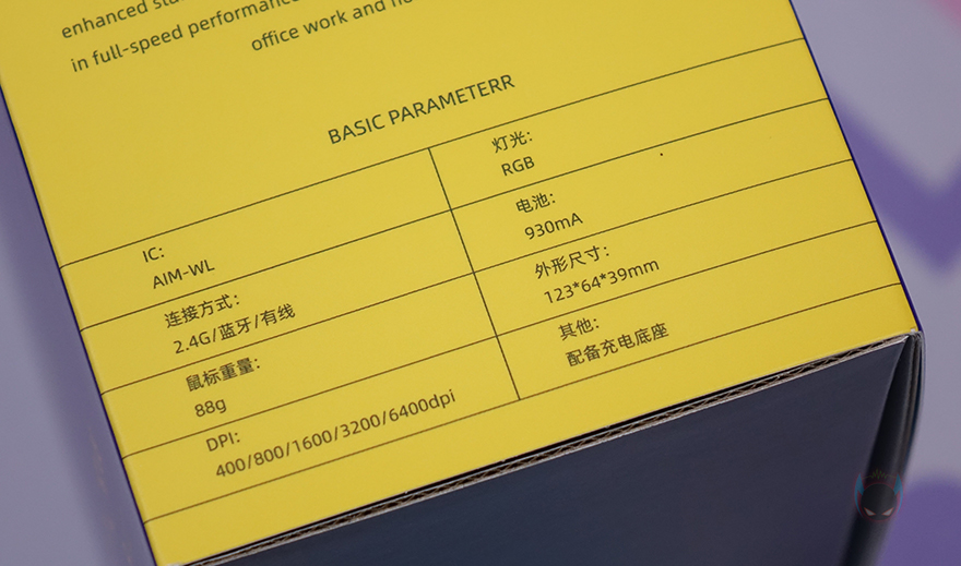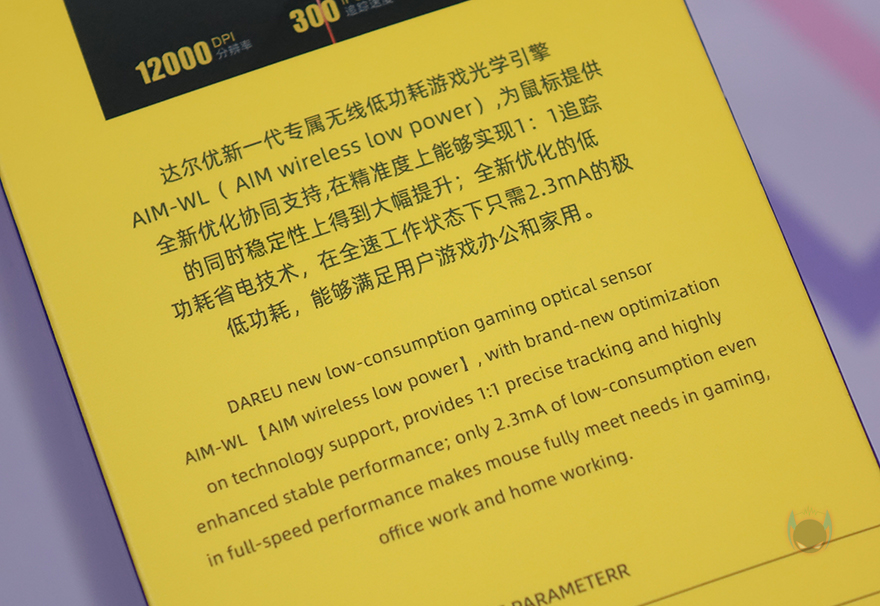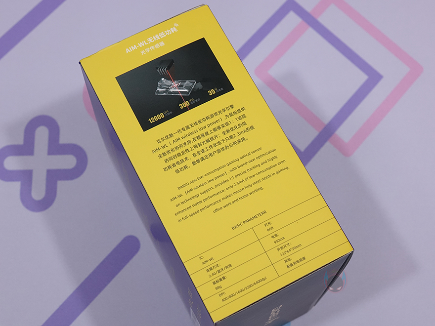 또한, 반대쪽 측면에는 센서에 대해서 언급하고 있는데, A950에 탑재된 광센서는 다얼유와 PixArt 공동개발한 AIM-WL라는 센서로 기존의 16핀이 아닌 8핀으로 저전력이면서 최대 12,000 DPI까지 지원하는 고성능 센서입니다. 참고로, 아래에 A950 기본 사양 표기를 보면 최대 6,400 DPI 지원이라고 표기되어있는데, 이는 기본 설정 최대이고 뒤에서 확인하겠지만, 프로그램을 통해서 최대 12,000 DPI까지 설정할 수 있습니다. 참고로 블루투스로 사용했을 시 기본 설정값 최대 DPI는 1600입니다.