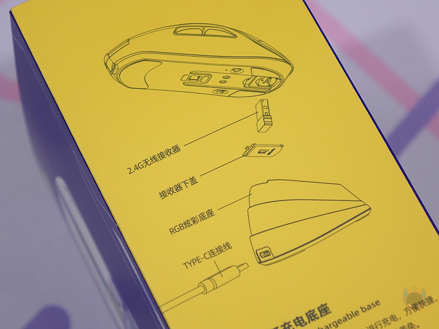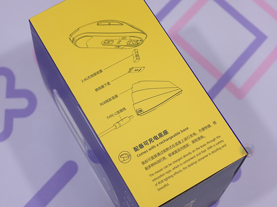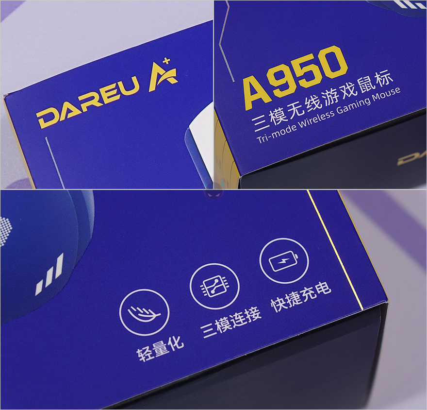제품 패키지를 살펴보기 전에, 필자의 경우 리뷰 샘플이 중국 내수용이라 국내 출시된 박스 패키지 디자인과는 차이가 있습니다. 제품 박스 전면에는 제품 이미지와 함께 DAREU A+ 표기와 모델명을 확인할 수 있는데, 시작에서도 언급했듯이 A+ 시리즈는 다얼유의 고급형 라인업입니다. 국내에는 이번 A950 마우스뿐만 아니라 앞전에 가스켓 하우징의 A98 및 A87 Pro 키보드가 먼저 출시되었는데, 이들 역시 A+ 라인업이죠. 전면에는 추가로 주요 특징에 초경량, 3가지 연결방식, 충전에 대한 표기를 해놨으며, 박스 한쪽 측면에는 이 제품이 대표적인 특징 중 하나인 전용 충전독과 무선 2.4GHz, 그리고 RGB 조명에 대한 표기를 추가로 확인할 수 있습니다.