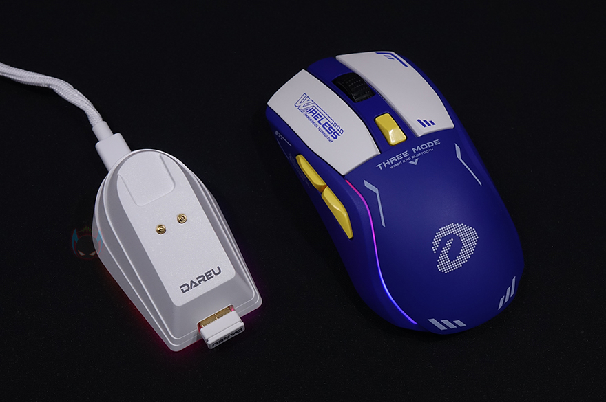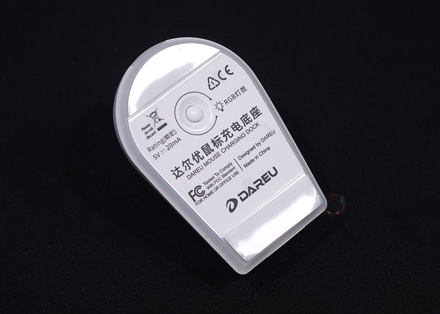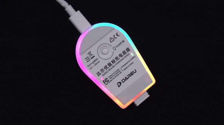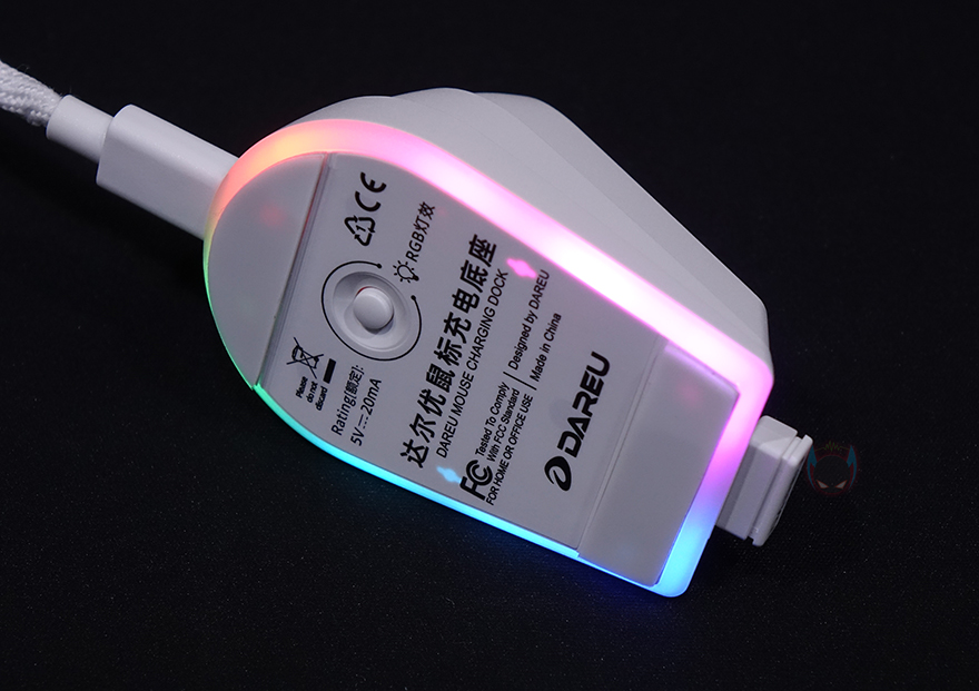직접, 다얼유 A950 게이밍 마우스를 사용해보면, 일단 전용 충전독에 마우스가 올려져있는 상태는 마치 비행기가 이륙하는 듯한 혹은 경쟁사 L사의 충전독 형태와 유사합니다. 그리고, 충전 중일 때 팜-레스트 테두리 라인의 RGB 조명은 배터리 상태로 점등되며, 충전독에서 분리되면 자동으로 RGB 조명 모드로 작동합니다. 또한, 앞서 언급한 대로 전용 충전독 역시 바닥 테두리 부분에 RGB 조명 효과를 갖추고 있는데, 바닥에 있는 버튼을 누르면, Off를 포함해 총 5가지 모드로 전환할 수 있죠.