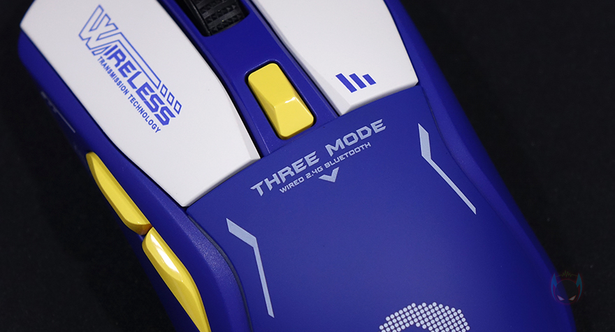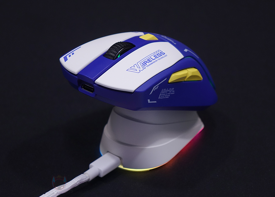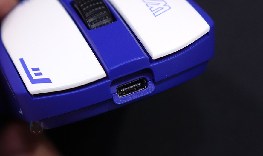 화이트 색상으로 구분되는 기본 좌우 버튼 같은경우에도 단순히 분리 설계만 적용된 것이 아니라 어떤 그립을 하더라도 균일하고 정확한 클릭감을 위해 Key Force Balance System이라는 KBS 2.0 기술설계가 적용되었습니다. 그리고 기본 좌우 버튼 가운데 배치된 휠-버튼 역시 스크롤 정확성과 접지력을 위해 고무 재질에 돌기형 디자인을 적용했으며, 바로 뒤에 배치된 DPI 버튼은 유광처리가 적용되었습니다. 또한, 마우스 전면에는 유선 사용 시 USB 전원 케이블과 연결되는 USB Type-C 포트가 적용되어 있습니다.