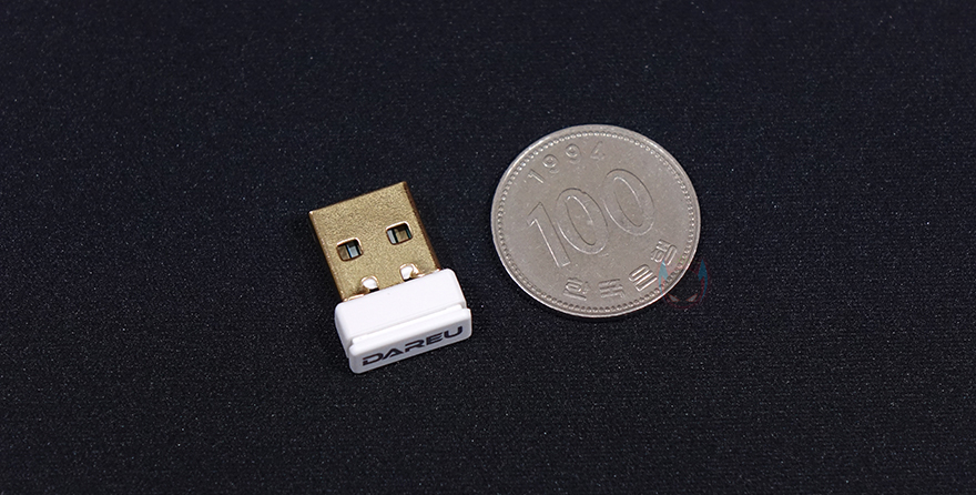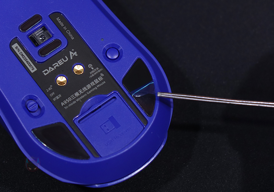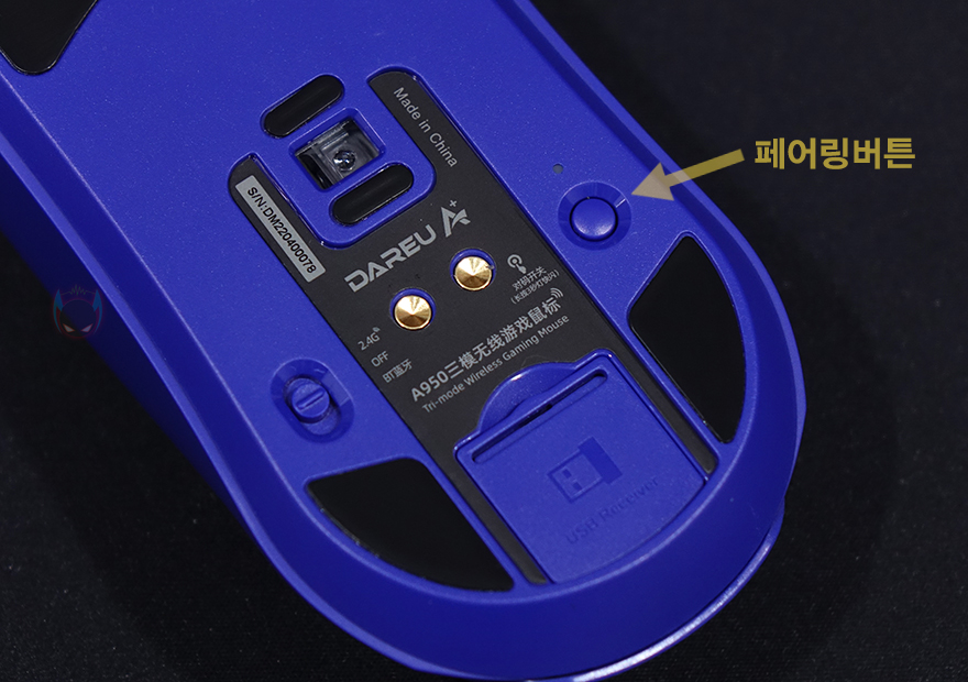 마우스 밑바닥부분에는 총 5곳에 피트가 부착되어 있는데, 모두 개봉 시에는 보호필름이 부착되어 있으며, 가운데 센서 배치와 함께 아래에는 전용 충전독과 연결되는 접지, 그리고 양쪽에는 각각 유무선 스위치(왼쪽)와 페어링 버튼(오른쪽)이 배치되어 있습니다. 유무선 스위치 같은 경우 위로 올리면 무선 2.4 GHz, 중간이면 Off, 아래로 내리면 블루투스 모드가 됩니다. 그리고, 맨 아랫부분에는 무선 2.4 GHz 사용 시 필요한 동글이가 수납되는 공간으로 커버를 열면 쉽게 확인할 수 있고, 동글이 크기는 동전 크기 정도로 흔히 말하는 나노 리시버입니다.