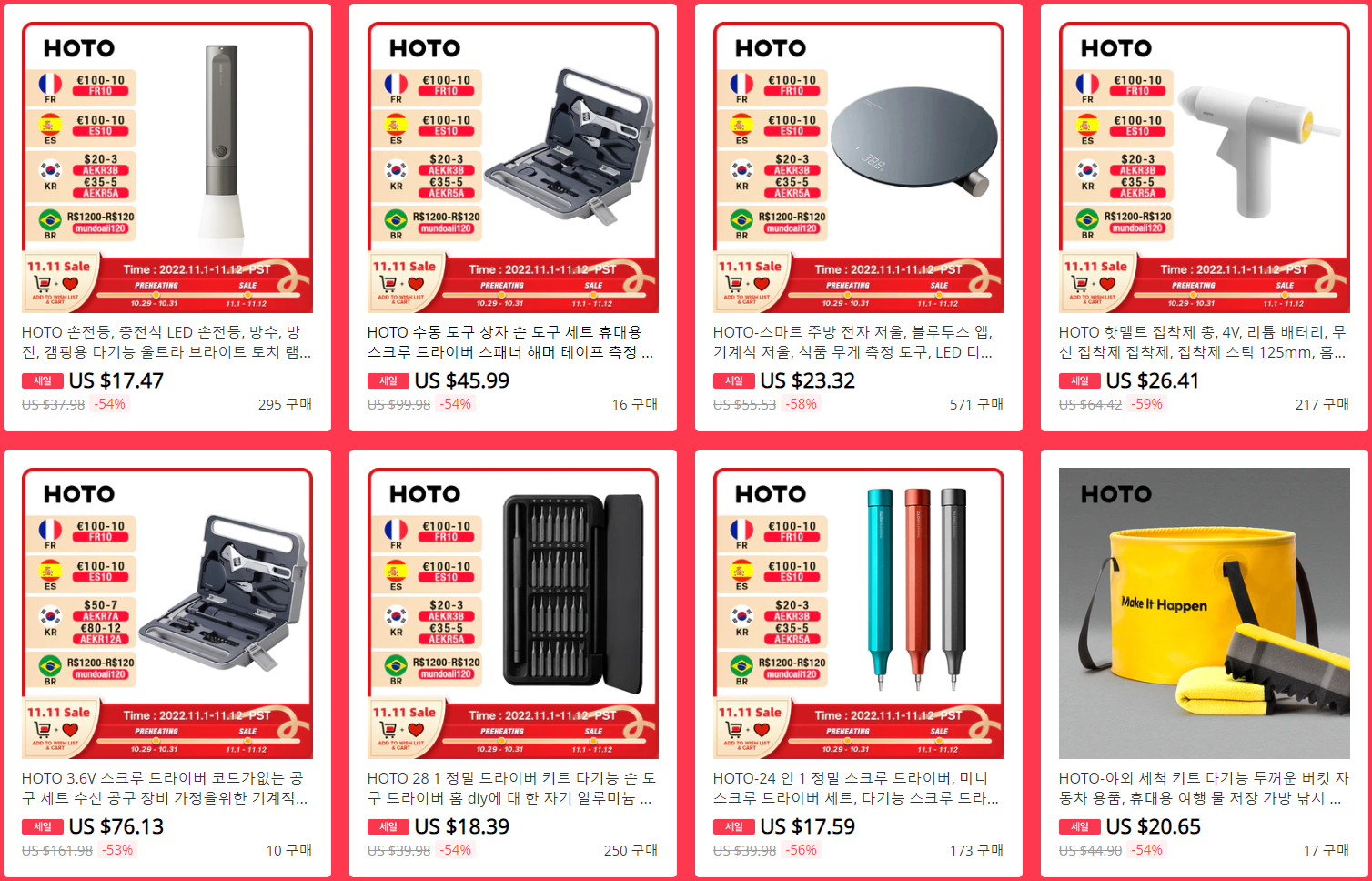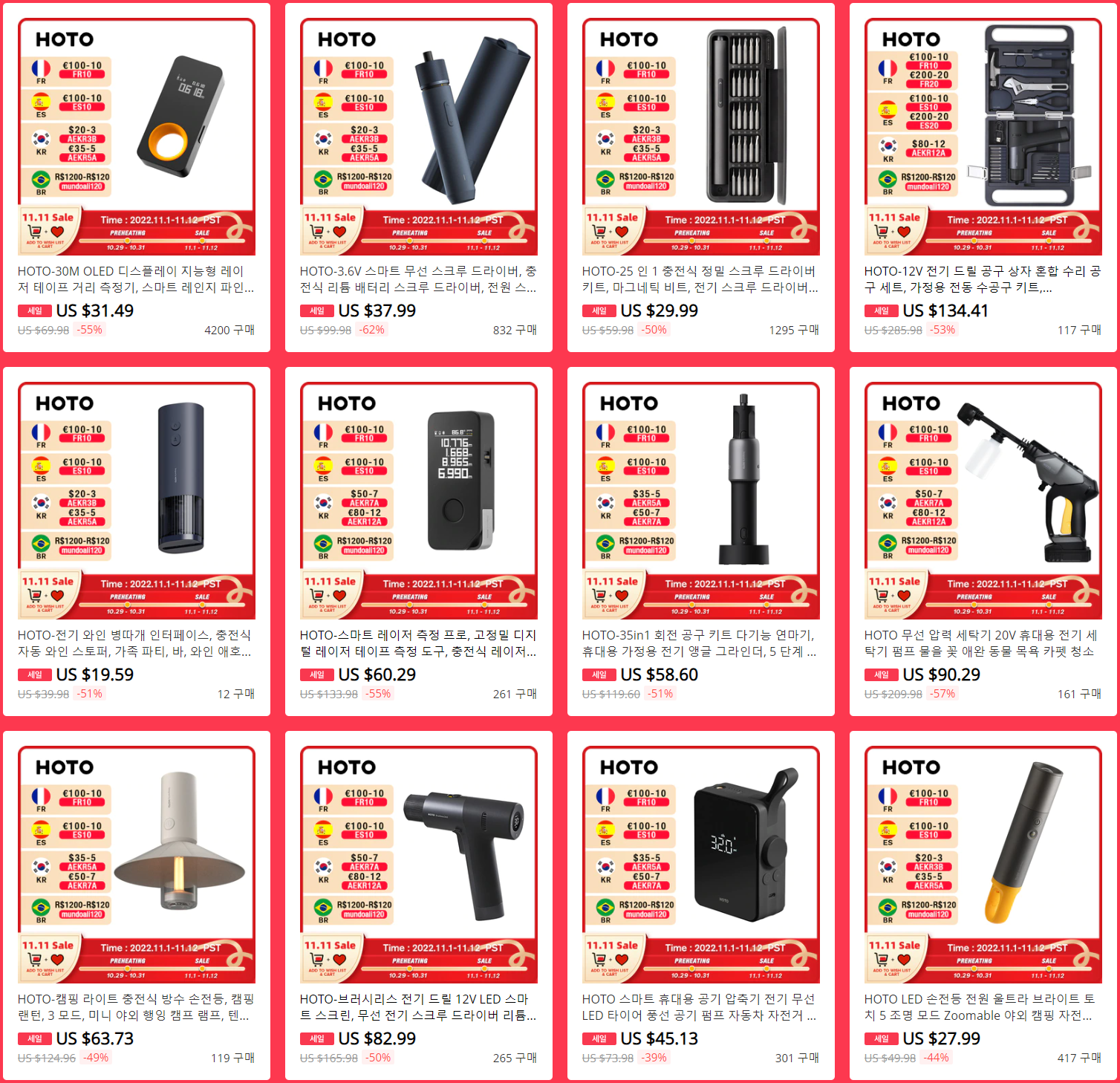 해외직구 쇼핑몰 알리익스프레스는 11월 중국 광군제 시기와 맞춰 오늘부터 13일간 11.11 행사를 시작한다. 글로벌 공구브랜드 HOTO 역시 알리익스프레스 공식 스토어에서 11.11 행사를 진행하는데, 무선 전동드릴부터 무선 글로건, 레이저 줄자, 종합 공구 세트 등 거의 전품목을 할인행사에 적용시켰다.
