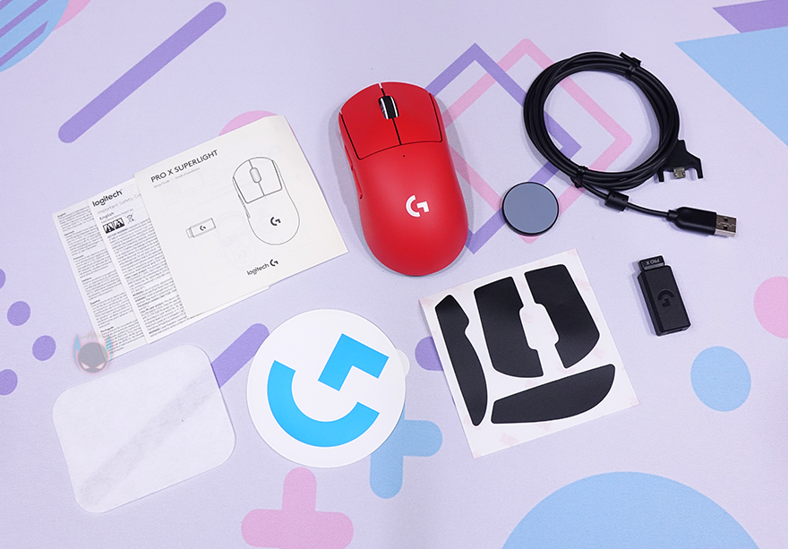 박스를 열어보면, 포장은 제품 크기에 맞춘 틀-방식의 포장재를 사용해 흔들리지 않게 했으며, 부속품들 역시 분실 및 흔들림방지를 위해 별도의 박스 포장으로 되어있죠. 제품 구성은 G PRO X SUPERLIGHT 레드 무선 게이밍 마우스, 수신기, 수신기 연장 어댑터, 충전 케이블, 천, 로고 스티커, 그립 테이프, 테프론 피트가 부착된 추가 교체용 개구부, 제품설명서 및 보증서로 이루어져 있습니다. 그리고, 개봉 시 마우스 밑바닥에도 보호비닐이 부착되어 있죠.