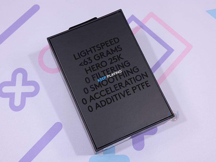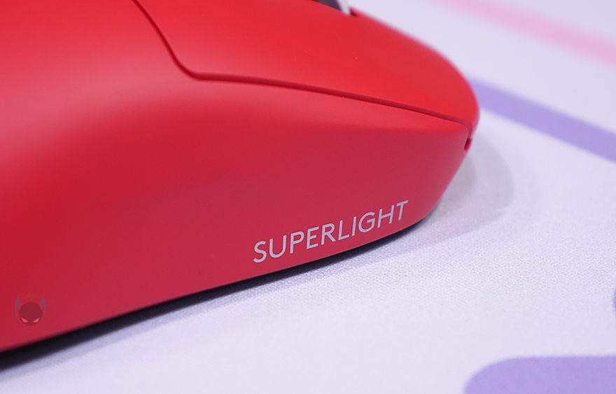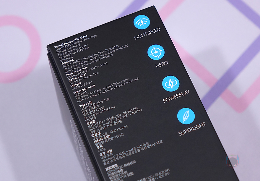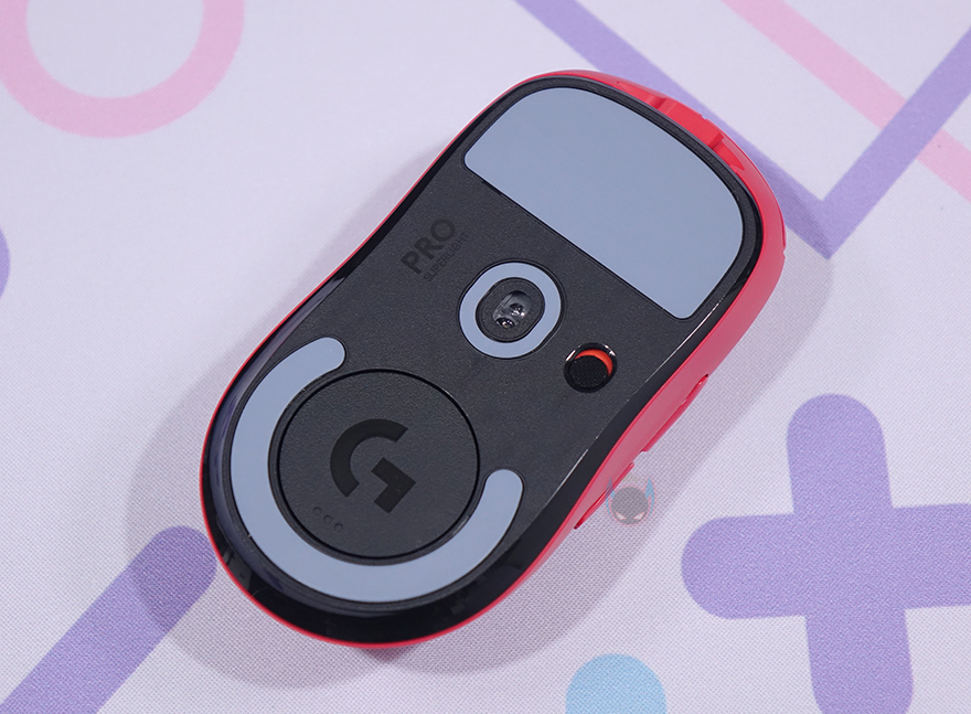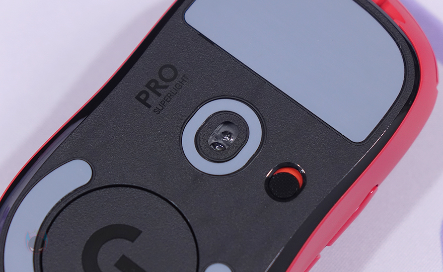 마우스 오른쪽 측면 앞부분에는 SUPERLIGHT 문구를 새겨놨으며, 왼쪽 측면에는 추가 버튼 2개 배치로 G PRO X SUPERLIGHT 마우스가 좌우대칭형을 가졌지만, 오른손잡이 마우스라는걸 규정하고 있습니다. 마우스 밑바닥 부분에는 앞부분에 널찍하게 테프론-피트를 부착해놨으며, 가운데 센서와 개구부 테두리 라인으로도 테프론-피트를 부착해놨습니다. 센서는 당연히 로지텍의 대표 센서인 HERO 25K를 내부에 탑재하고 있으며, 센서 오른쪽에 무선 On/Off 스위치가 배치되어 있습니다.