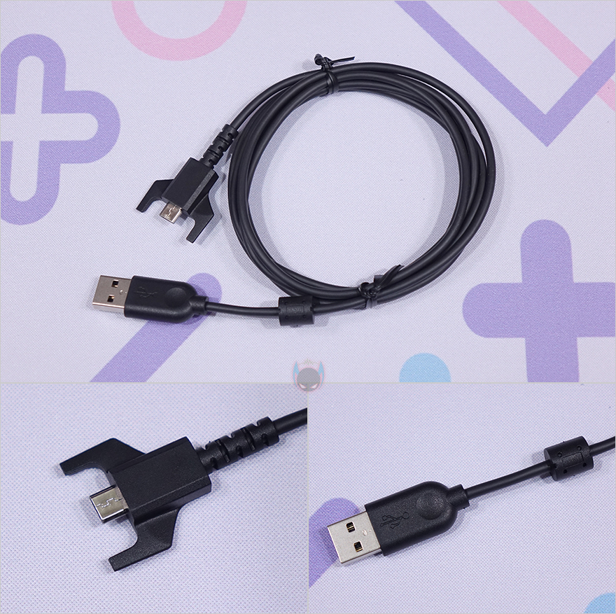 센서 바로 아래에는 개구부 그러니깐 무선 수신기가 수납되는 공간의 커버가 적용되어 있는데, 자석방식으로 쉽게 분리할 수 있으며, 별도로 판매되는 충전독을 사용하면 수납공간 양쪽에 있는 접지를 통해 충전독에 올려서 상시 충전시켜둘 수 있습니다. 또한, 추가로 제공되는 또하나의 개구부 커버는 테프론-피트가 부착된 형태로 마우스 움직임이 부족하다 싶으면 교체해서 사용하면 되죠. 그리고, 마우스 전면에는 충전 케이블과 연결되는 마이크로 USB 포트가 적용되어 있는데, 충전 케이블을 확인해보면 포트 디자인에 맞춘 전용 디자인과 반대쪽은 USB Type-A 인터페이스와 노이즈 필터가 적용된 것을 확인할 수 있습니다.