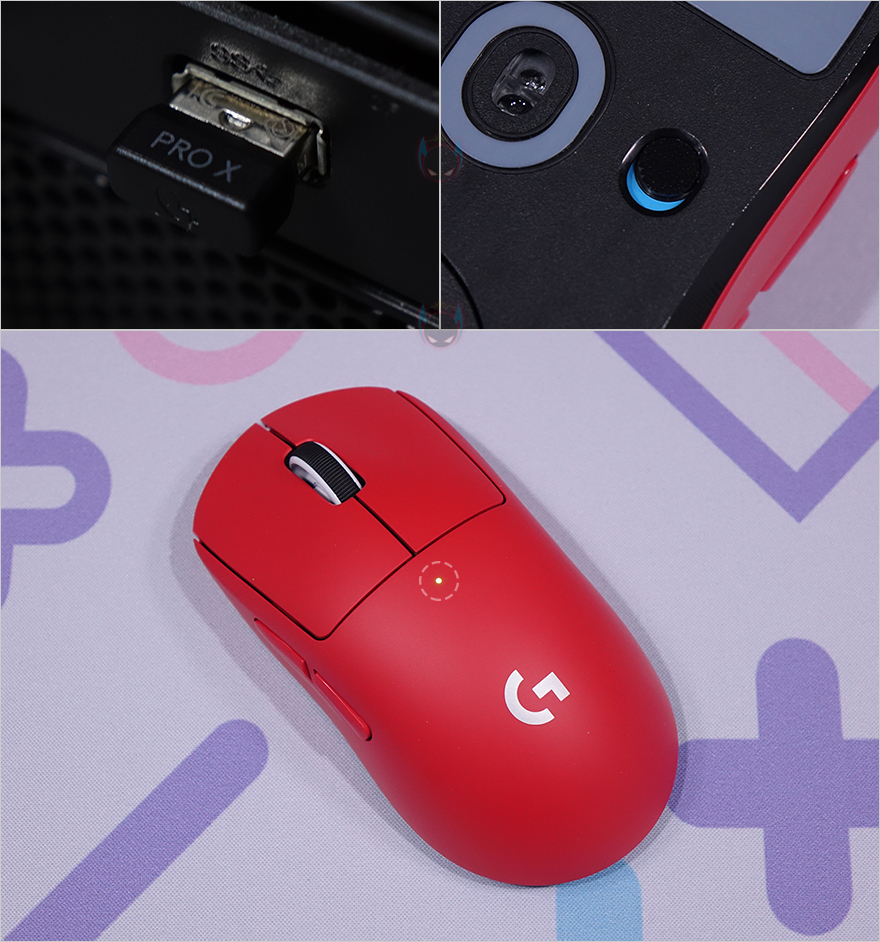 로지텍 G PRO X SUPERLIGHT 레드 무선 게이밍 마우스를 직접 사용해보면, 연결은 수신기를 PC나 노트북에 연결한 후 마우스 밑바닥에 무선 On/Off 스위치를 On으로 켜면 마우스 상단 LED 인디케이터에서 잠깐 LED가 점등되면서 바로 연결이 됩니다. 연결이 되면 별도의 드라이버 설치 없이 바로 사용이 가능하죠. 연결에 특별히 어려운 점은 없습니다. 참고로, 무선 사용시간은 최대 70시간입니다.