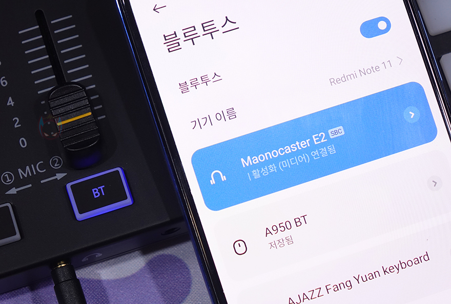 물론, MAONOCASTER E2 오디오 인터페이스는 꼭 PC만 연결해서 사용하는건 아니죠. 모바일 기기 그러니깐 스마트폰도 USB Type-C 포트에 연결하면 사용할 수 있습니다. 여기에 배경음악이 필요하다면 블루투스로 또 다른 스마트폰을 하나 더 연결하면 되죠. 블루투스 연결은 다른 기기들처럼 페어링 방식으로 연결하는 거라 어렵지 않습니다. 그리고, 애플 아이폰이나 아이패드로 연결해서 사용하고 싶다면, 앞서 언급했듯이 LIVEOUTPUT 1,2 단자에 연결해서 사용하면 됩니다.