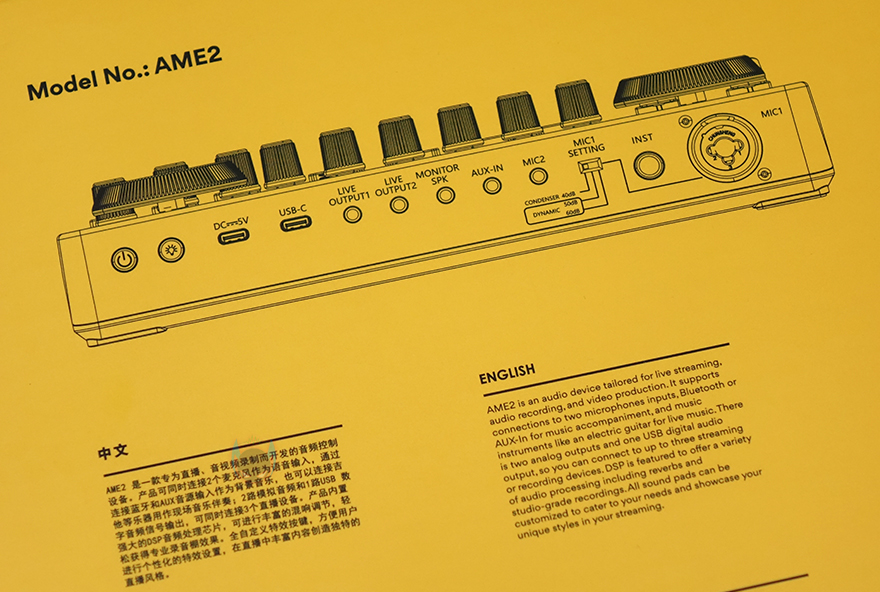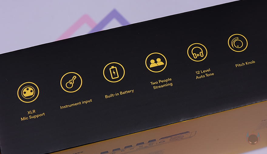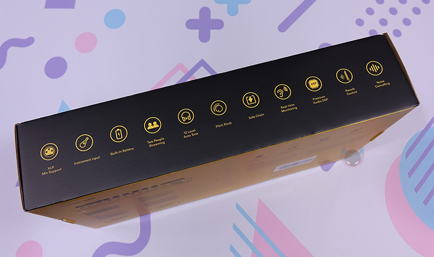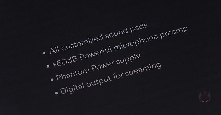 제품 패키지부터 살펴보면, 박스 포장으로 전면에는 제품 이미지를 담고 있어서 어떤 디자인의 오디오 인터페이스인지를 간접적으로 확인할 수 있으며, 모델명과 함께 이 제품의 주요 특징으로 커스텀 사운드 패드(Customized sound pads), 최대 60dB 마이크 감도, 팬텀 파워, 디지털 출력 지원 등을 표기해놨습니다. 물론, 가성비 오디오 인터페이스 제품이라고 언급했는데, 이 정도만 특징으로 언급하면 안 되겠죠. 그래서, 박스 측면에 보면 XLR 마이크 지원부터 악기, 배터리, 2인 마이크, 12단계 오토튠, 실시간 모니터링, 고급 오디오 칩셋, 노이즈 캔슬링 등 총 11가지를 추가로 표기해놨습니다.