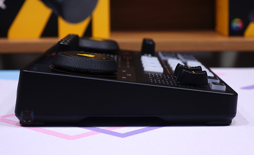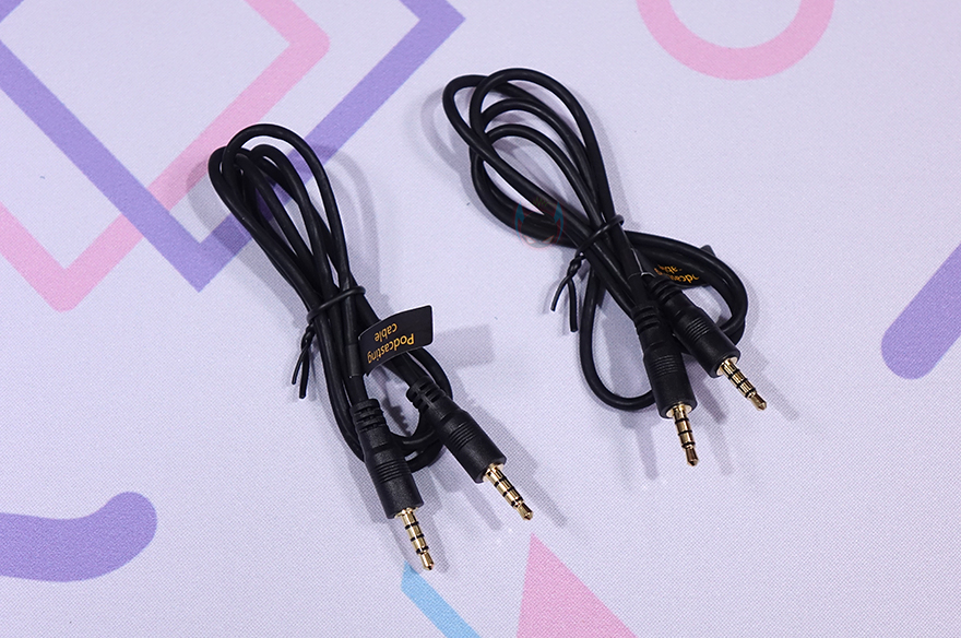 이 밖에 본체 측면에서 보면, 키보드처럼 편하게 사용할 수 있게 경사진 높이를 갖추고 있으며, 맡바닥부분에는 모서리 부근에 미끄럼 방지를 위해 고무 패드가 부착되어 있습니다. 끝으로, 오디오 케이블은 3.5mm TRRS 케이블로 2개 제공해주고 있으며, 길이는 약 80cm이고, PC와 모바일 기기에 연결할 때 사용되는 USB 케이블은 약 1.8m 길이에 USB Type-C to A 인터페이스로 노이즈 필터도 함께 적용되어 있습니다.
