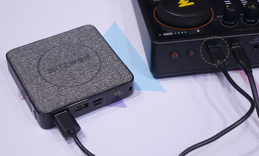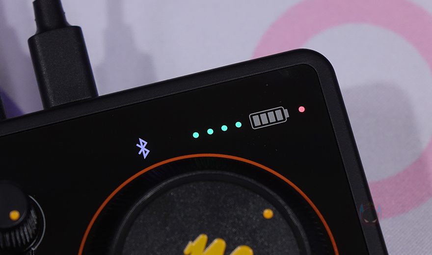 끝으로, MAONOCASTER E2 오디오 인터페이스를 사용하면 게이지부터 각 패드의 LED 점등까지 다양하게 라이트 효과가 작동되는데, 앞서 확인했듯이 전원버튼 옆에 배치된 LED On/Off 버튼을 사용하면 한 번에 LED 효과를 On/Off 할 수 있습니다. 그리고, 이 제품은 내부에 2,000mAh 배터리 내장으로 최대 8시간을 무선으로 사용할 수 있는 동시에 전원(DC) 연결도 USB Type-C로 지원하기 때문에 충전 어댑터뿐만 아니라 보조배터리를 연결하면 더 오래 사용할 수 있죠. 물론, 맨 오른쪽 상단에 배터리 충전 및 잔량 상태도 실시간으로 확인할 수 있습니다.
