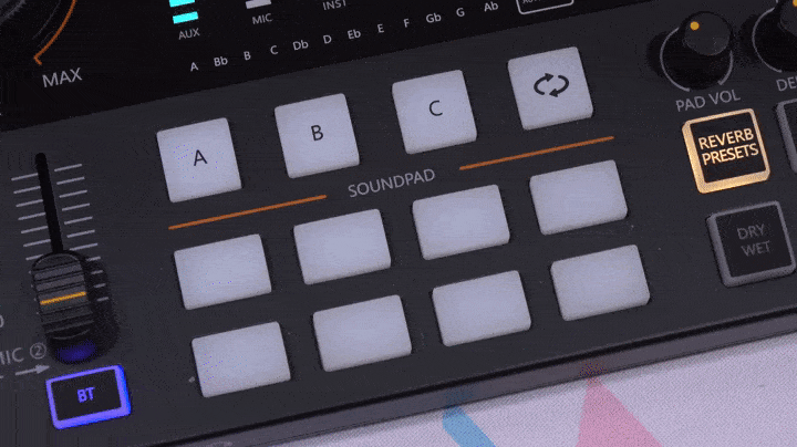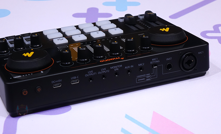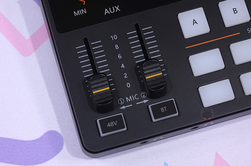 아래쪽 인터페이스에는 가운데 부분에 사운드 패드(Sound Pad)로 위쪽에 배치된 A/B/C 패드는 1분 녹음할 수 있으며, 아래쪽에 8개의 패드는 커스텀 패드(Custom pad)로 20초 녹음할 수 있습니다. 그리고, A/B/C 패드 오른쪽에는 A/B/C 패드에 녹음한 사운드를 반복 재생 On/Off 할 수 있는 버튼이 배치되어 있죠. 그리고, 패드 기준으로 왼쪽에는 마이크 1, 마이크 2의 게인(Gain) 조절 믹서가 있으며, 아래에는 콘덴서 마이크 사용 시 48V 팬텀 파워 On/Off 버튼, 블루투스(Bluetooth) On/Off 버튼이 배치되어 있습니다. 또한, 사운드 패드 기준으로 왼쪽에는 패드 볼륨을 조절할 수 있는 PAD VOL 노브(Knob)를 비롯해, 마이크 에코 효과라 할 수 있는 REVERB의 DEPTH와 DECAY TIME 노브가 있으며, 그 아래에는 REVERB PRESETS, SIDE CHAIN, MUSIC ONLY, DRY WET, LOOP BACK, DENOISE 버튼이 배치되어 있습니다. 이 기능 들은 뒤에서 다시 한번 언급하죠.
