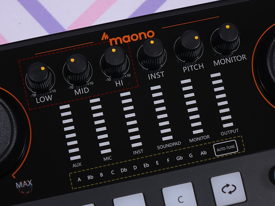 MAONO(마오노) MAONOCASTER E2 오디오 인터페이스를 본격적으로 살펴보면, 인터페이스는 크게 위아래로 나뉘어져 있는데, 일단 윗부분에는 가운데 맨 위에 마이크 음량(Pitch) 조절의 LOW/MID/HI 노브(Knob)를 비롯해 악기 연결 시 볼륨 조절 INST 노브, 음성변조를 알 수 있는 PITCH 노브, 사운드 모니터링 볼륨 조절의 MONTOR 노브가 배치되어 있으며, 바로 아래에는 오디오, 마이크, 악기, 사운드 패드, 모니터링, 사운드 출력의 게이지(gauge)를 확인할 수 있게 배치해놨습니다. 그리고, 그 아래에는 12개의 오토튠(Auto-tune)이 적용되어있는데, 조금 아쉬운 점이라면 메이저로만 변경할 수 있습니다.