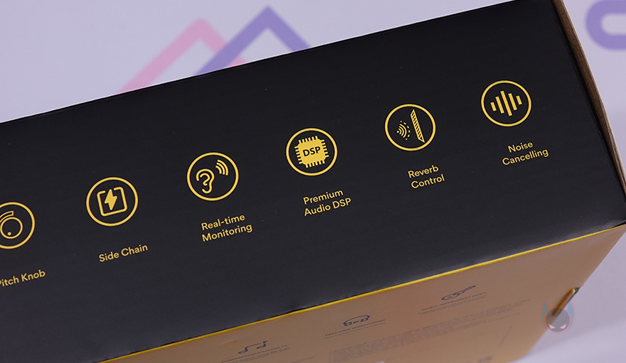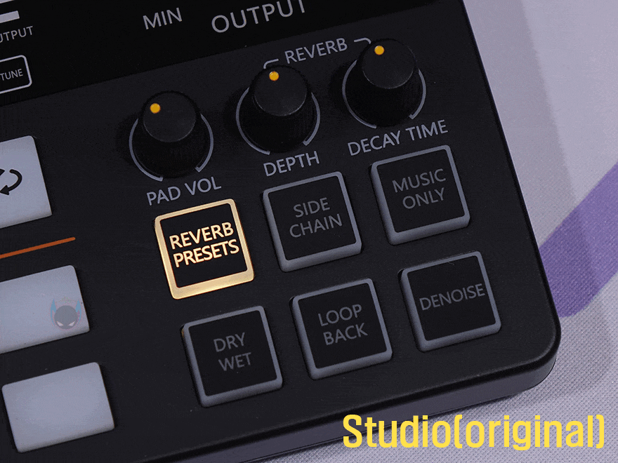 일부 기능들에 대해서 언급을 해보자면, REVERB PRESETS은 쉽게 말해 에코(echo) 모드라고 생각하면 되는데, 에코가 없는 Studio 모드를 비롯해 총 6가지 모드 지원으로 모드별로 6가지 컬러 LED(Color LED)효과로 쉽게 구분을 해주는 동시에 각 모드 전환 시 음성으로도 알려줍니다. 이밖에 라이브 방송 중에 목소리를 낼 경우 자동으로 배경 사운드를 줄여주는 SIDE CHAIN, 노래 같은 배경 사운드에서 음성적인 부분을 줄여주는 MUSIC ONLY, 목소리와 배경 사운드를 구분해서 녹음할 수 있는 DRY WET, 목소리와 배경 사운드 모두 출력하는 LOOPBACK, 주변 소음을 줄여주는 DENOISE 모드들은 모두 활성화되었을 시 역시 LED 점등으로 보여줍니다. 그리고, 사운드 패드(Sound Pad) 같은 경우에는 1분 녹음의 A/B/C 패드나 아래에 커스텀 패드 모두 원하는 패드를 길게 누르면 깜빡임이 시작되는데, 이때 녹음이 시작되고, 1분과 20초 모두 꼭 제한된 시간까지 녹음할 필요는 없고 패드를 다시 한번 누르면 녹음이 바로 종료됩니다. 그리고, A/B/C 패드는 무한 재생을 할 수 있죠. 라이브 방송을 할 때 중간중간에 적절한 사운드 효과를 줄 수 있어서 효과적인 기능이라 할 수 있습니다.