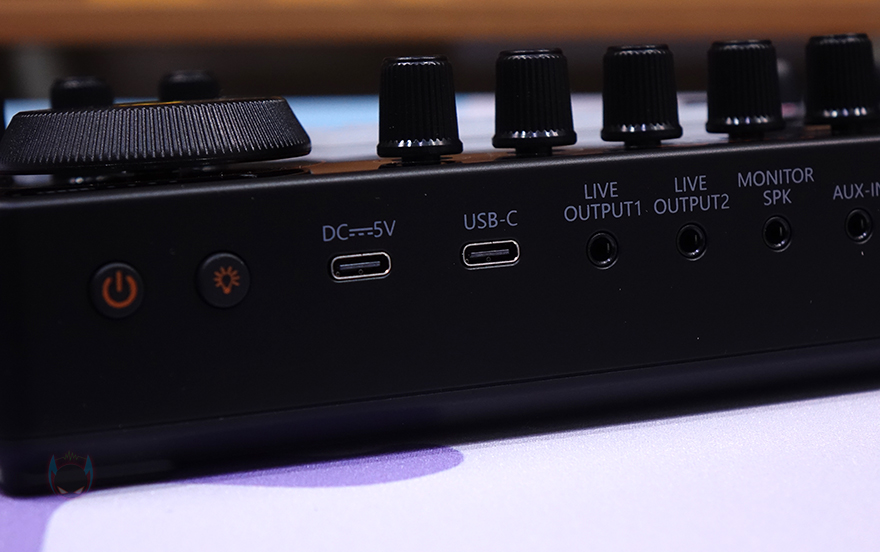 MAONOCASTER E2 오디오 인터페이스 전면에는 버튼과 장치 연결을 할 수 있는 포트들이 배치되어 있는데, 왼쪽부터 전원버튼과 LED On/Off 버튼이 적용되어 있으며, 그 옆에는 2개의 USB Type-C 포트가 있는데, 하나는 전원 포트(DC)로 보조배터리를 연결해서 사용할 수도 있습니다. 그리고, 나머지 하나의 Type-C 포트는 PC나 모바일 기기와 연결하는 포트죠. 그 옆으로는 LIVE OUTPUT1/2가 있는데 애플 아이폰이나 아이패드 연결 시 사용됩니다. 또한, 옆으로 계속 보면, 스피커(Speaker) 연결, 오디오(AUX) 연결, 마이크 2, 마이크 1 설정, 악기 연결(INST), 마이크 1 포트로 배치되어 있습니다. 특히, 마이크 연결은 마이크 1은 XLR 지원으로 콘덴서나 다이내믹 마이크로 연결해서 마이크 1 설정(MIC1 SETTING)을 통해 감도 선택을 할 수 있으며, 마이크 2는 잭 방식으로 연결됩니다. 그리고, 본체 왼쪽 아랫부분에는 실시간으로 출력 사운드를 모니터링할 수 있게 헤드폰 단자도 2개 갖추고 있죠.