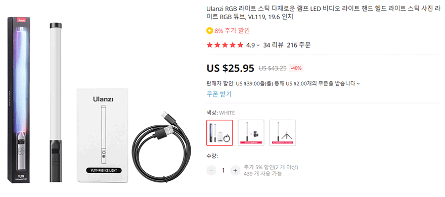 개인방송이나 혹은 콘텐츠 촬영을 위해서 조명은 필수적인 장비죠. 특히, 요즘은 LED 조명을 많이 사용하는데, LED 조명이 등장하면서 일반적으로 생각하는 화이트 색상의 조명 외에도 컬러풀한 RGB 조명을 사용하는 경우도 많아졌습니다. 그중에서도 최근 각광받는 조명 중 하나가 바로 스틱 형태의 조명인데, 가성비 촬영장비 브랜드 중 하나인 Ulanzi(울란지)에서도 이런 스틱 형태의 조명 제품들이 꽤 있죠. 앞서 짧은 길이에 마그네틱 방식의 VL110 모델을 만나봤다면, 이번 시간에는 이보다 긴 스틱형태의 제품 바로, VL119를 한 번 만나볼까 합니다. 그럼, Ulanzi(울란지) VL119 RGB 조명을 한 번 살펴보도록 하죠.