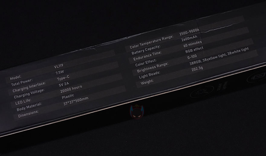 VL119는 스틱 형태의 조명 제품이라는 걸 제품 박스를 보면 쉽게 알 수 있죠. 긴 박스 형태에 전체 비닐로 밀봉처리가 되어있어서 소비자 입장에선 판매 제품에 신뢰를 가질 수 있습니다. 참고로, Ulanzi(울란지) 알리익스프레스 스토어에 구매할 시에는 케이블, 볼헤드, 삼각대 3가지 추가 구성품 제공 옵션 중 선택할 수 있습니다. 그리고, 박스 전면에는 제품 이미지와 함께 모델명을 확인할 수 있으며, 박스 측면에는 주요 특징으로 20가지 조명모드, 2600mAh 배터리, 2500~9000K 색온도 범위를 표기해놨죠. 물론, 박스 후면에서 제품의 기본 사양 표기도 확인할 수 있습니다.
