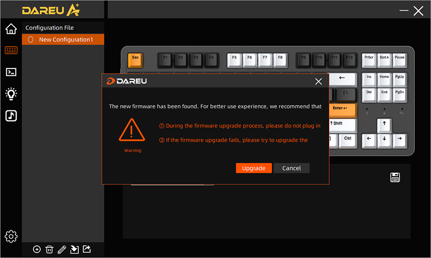 그리고, A87 Pro 유무선 3모드 키보드 역시 전용 소프트웨어를 제공해주고 있는데, 국내에선 비프렌드의 다얼유 게이밍샵에서 소프트웨어를 다운로드 받을 수 있으며, 설치 후 실행해보면, 기능들은 앞서 만난 A98 키보드와 거의 동일합니다. 메뉴는 크게 키 기능 변경, 매크로, RGB 조명, 그리고 프로그램을 통해 사용할 수 있는 리듬 조명 기능으로, 키 기능 변경은 기본 기능부터 매크로, 마우스, 멀티미디어 핫-키 등 기능으로 변경할 수 있으며, 매크로 기능 역시 A98 키보드와 동일한 방법으로 매크로 파일을 생성해서 기록하고 저장한 후 키 기능에서 매크로 실행키를 설정해주면 됩니다. RGB 조명은 앞서 확인한 7가지 모드를 프로그램에서도 선택할 수 있고, 리듬 조명은 PC 사운드에 반응하는 조명으로 배경색과 반응색을 사용자가 지정해서 다양해서 연출할 수 있습니다. 물론, 프로그램을 사용할 때는 유선으로 연결해서 사용해야 하고, 프로그램에 펌웨어 업데이트 기능도 있기 때문에, 실행 시 자동으로 업데이트 진행이 있으면 메시지 창을 띄워줍니다.