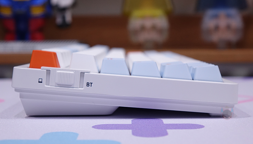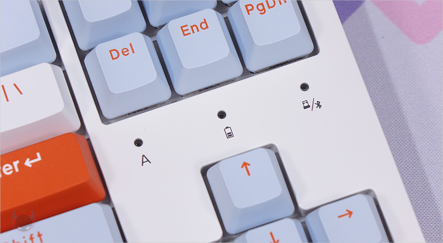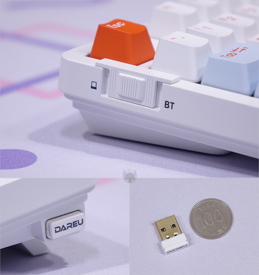 전형적인 87키 배열의 텐키리스 모델이지만, 유선/무선 2.4GHz/블루투스 3가지 연결방식을 지원하기때문에, 방향키 위에 배치된 LED 인디케이터는 이런 연결방식을 확인할 수 있는 표기로 처리되어 있으며, A98 모델과 마찬가지로 왼쪽 측면에 유무선 스위치, 그리고 오른쪽 측면에 무선 2.4GHz 사용 시 필요한 동글이가 수납되어 있습니다. 역시 크기는 동전보다 작은 일명 나노 리시버죠.