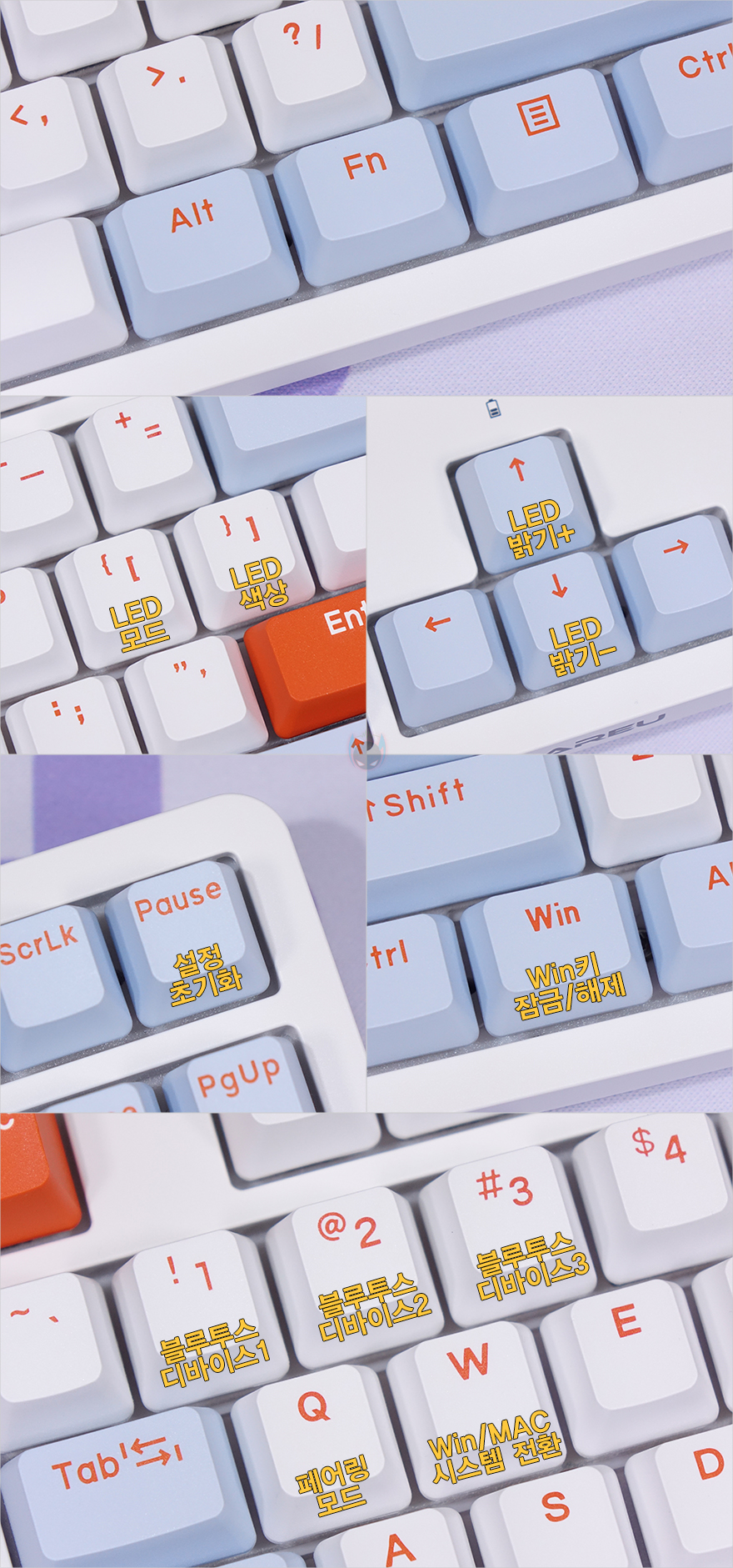 다얼유 A87 Pro 유무선 3모드 키보드 역시 Fn키를 갖추고 부가 기능을 지원해주고 있는데, 대부분 기능은 앞서 만난 A98과 유사합니다. 일단, [ 키와 ] 키를 통해서 LED 모드와 색상 변경을 할 수 있으며, 상하(↑↓) 방향키를 통해서 밝기조절을 할 수 있죠. 그리고, Pause키를 Fn와 함께 5초간 누르고 있으면 설정 초기화, 윈도우키는 잠금/해제 할 수 있습니다. 이 밖에 숫자키 1/2/3 역시 A98 키보드와 동일하게 블루투스 디바이스 기능이며, Q키는 페어링모드, W키는 윈도우/Mac 전환 기능을 가지고 있죠. 또한, F1~F12키들도 역시 부가기능들로 화면밝기, 창 전환, 검색, 재생 컨트롤, 볼륨조절 등의 기능을 가지고 있습니다.