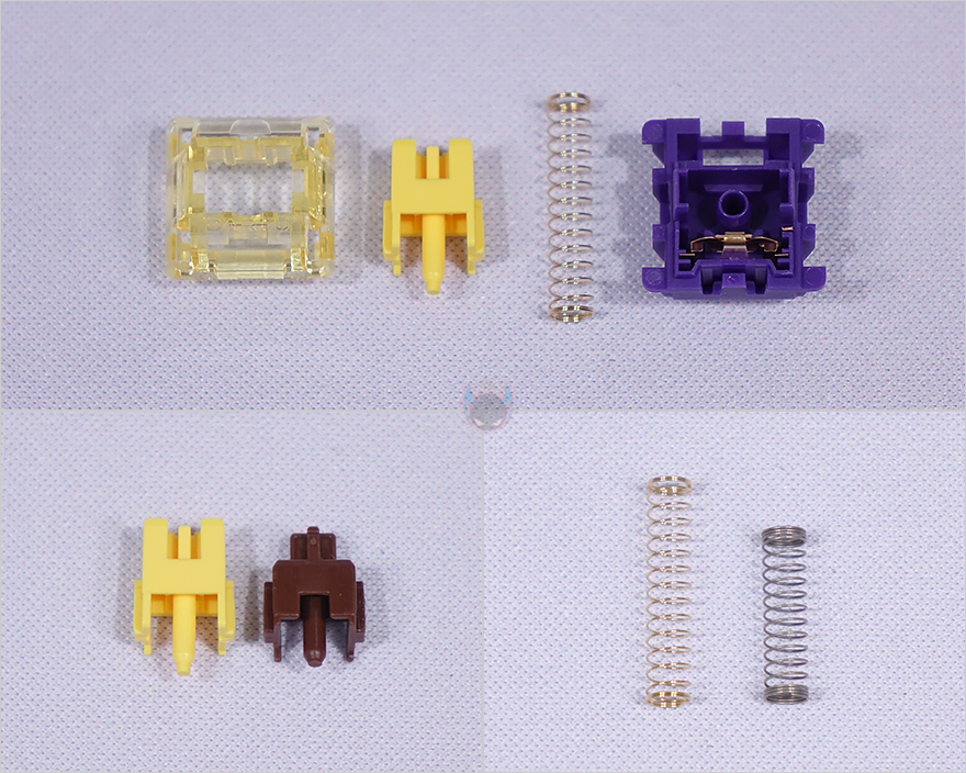 다얼유 바이올렛 골드 프로 스위치를 살펴보면, 스위치 이름답게 하우징의 상단 케이스와 하단 케이스가 각각 골드와 보라색인것을 확인할 수 있습니다. 그리고, 스템 부분도 옐로우 색상으로 디자인은 카일 박스형처럼 적용되어 있죠. 참고로, 기본 바이올렛 골드 스위치는 박스가 없는 기본 +자형입니다. 그리고, 시작에서도 언급했듯이 바이올렛 골드 프로 스위치는 넌클릭 타입으로 체리 스위치로 비교하자면, 갈축에 해당합니다. 실제 스위치 사양을 확인해봐도 입력 지점과 걸리는 지점 압력이 체리 MX 갈축과 동일하죠. 다만, 오차범위가 훨씬 작습니다. 실제로 스위치를 분해서 스템과 스프링을 체리 MX 갈축과 비교해보면 스템 기둥은 좀 더 길고, 스프링도 긴 편이죠. 실제로 체감해보면 갈축과 키압은 비슷하나 좀 더 반발력이 있다는 느낌이 듭니다.