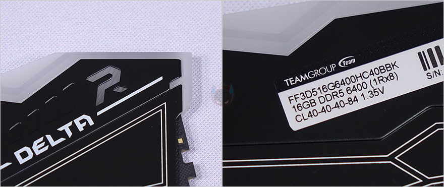 그리고, 방열판 가운데는 T-FORCE 로고를 새겨놨으며, 왼쪽에는 DDR5 RGB, 오른쪽에는 DELTA 표기를 해놨는데, 표기 바로 위에 R자 형태의 문구 디자인도 RGB 조명을 볼 수 있는 부분이고, 반대쪽 방열판에는 제품의 용량 및 램 타이밍 값을 확인할 수 있습니다. 그리고, RGB 조명-바 상단 맨 한쪽에도 T-FORCE 표기를 해놨죠.