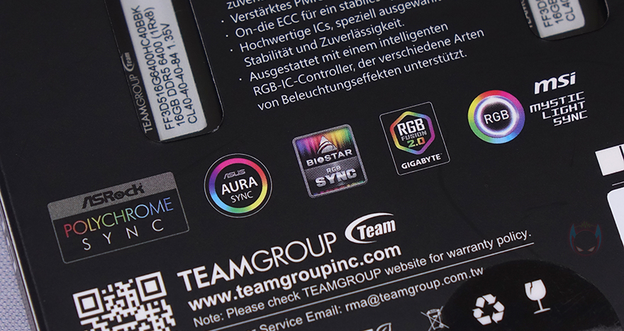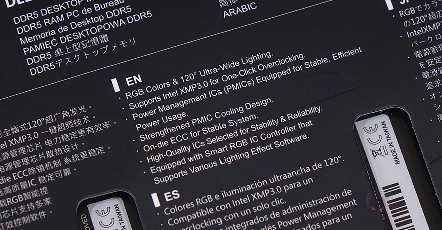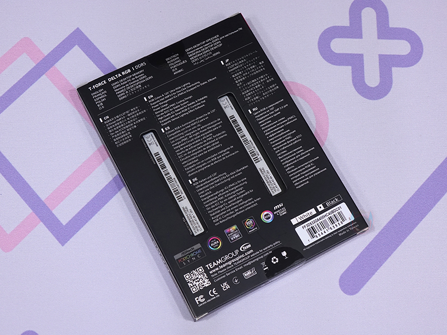박스 후면에는 제품의 주요 특징을 각 나라별 언어로 표기해놨는데, 한국어는 포함되어 있지 않고, 특징에는 120도 RGB 조명, 인텔 XMP 3.0 적용, 전력 관리 PMICs 칩셋, ECC(실시간 데이터 자가 보정기술) 적용 등을 표기해 놨습니다. 그리고, 아래에는 주요 글로벌 메인보드 5개 브랜드의 RGB 조명 연동 지원도 확인할 수 있죠. 제품 포장은 다른 메모리 제품들처럼 투명-보호 캡 방식을 적용하고 있으며, 구성품은 간단하게 DELTA RGB DDR5 6400 CL40 메모리, 품질보증서, 로고 스티커 제공으로 이루어져 있습니다.