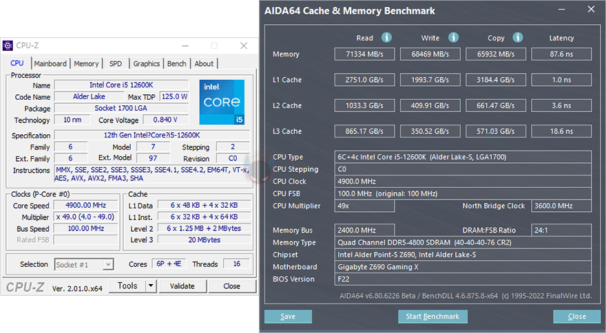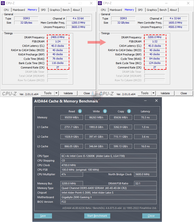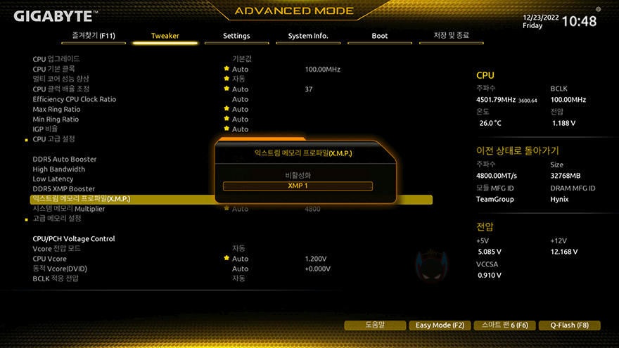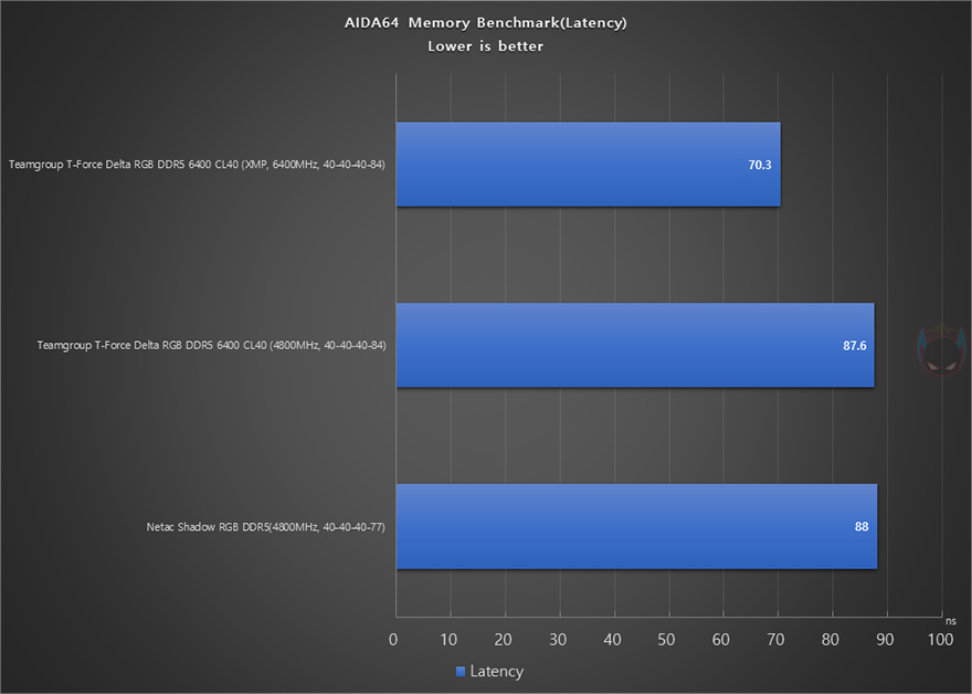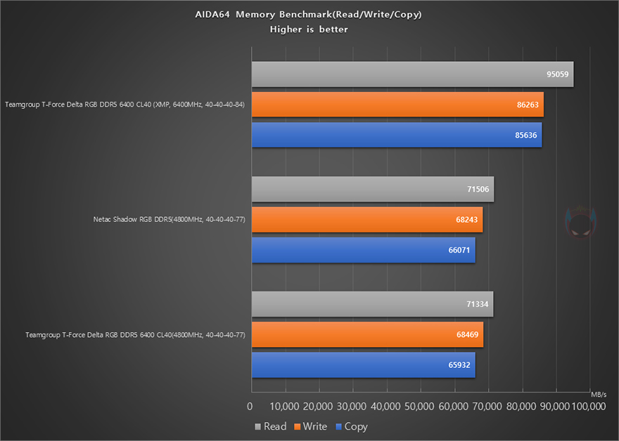 실제로 메인보드 BIOS에서 Teamgroup DELTA RGB DDR5 6400 CL40 메모리의 XMP 프로파일을 적용시키면, 6400MHz 클럭으로 쉽게 적용되는 것을 확인할 수 있으며, 기본작동 클럭일 때보다 대역폭과 레이턴시 모두 성능이 향상된 것을 확인할 수 있습니다.